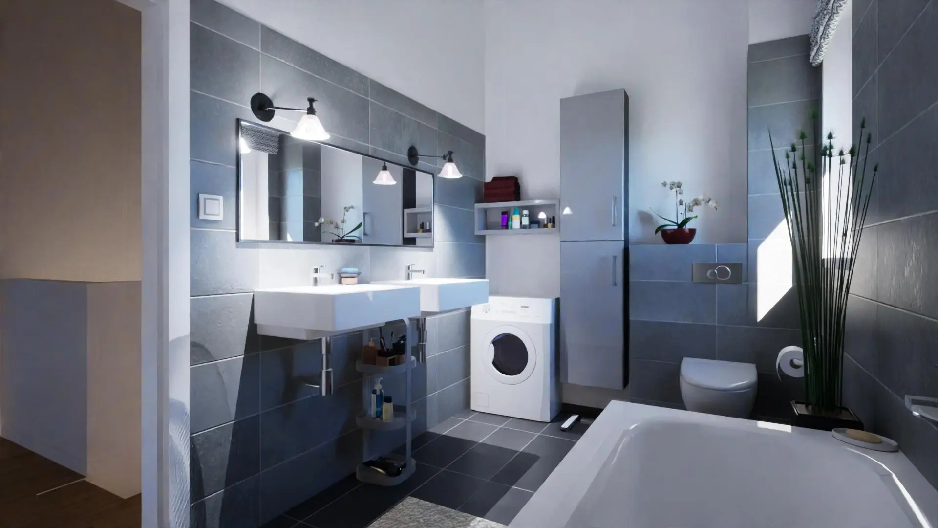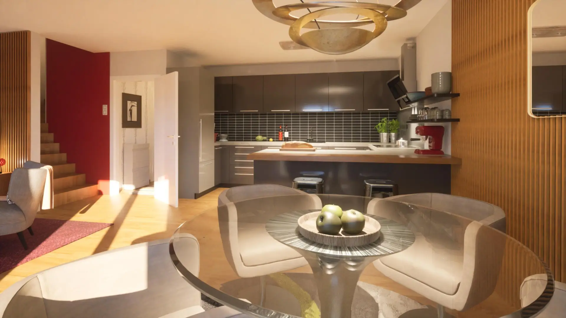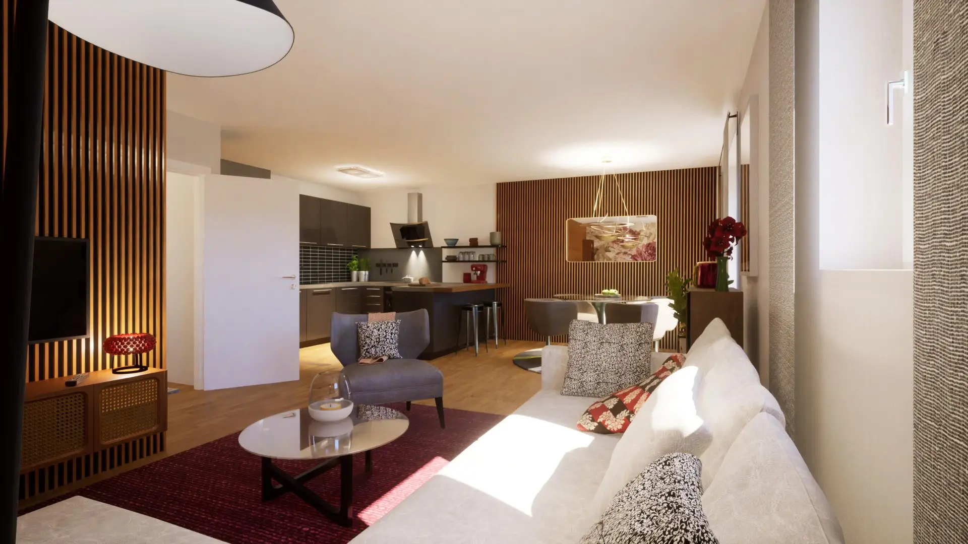 Sonnige Wohnküche, Abstellraum, Technikraum, 3 zentral begehbare Schlafzimmer, Bad und 2 WC´s.
