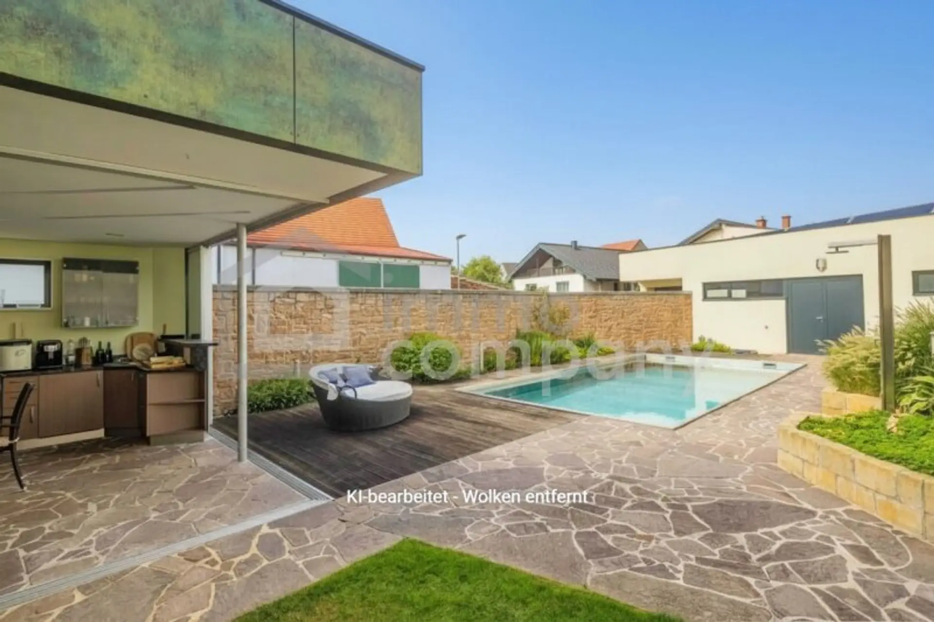 Der gemütliche Garten mit Pool (Niro-Pool mit Gegenstromanlage + Solaranlage beheizt), Poolhaus mit Bar, Schiebetüren & Schaltzentrale, sowie das großzügige Nebengebäude wird Sie zusätzlich begeistern. Das Nebengebäude ist vielseitig nutzbar... :-) wir sind auf Ihre Ideen gespannt :-)