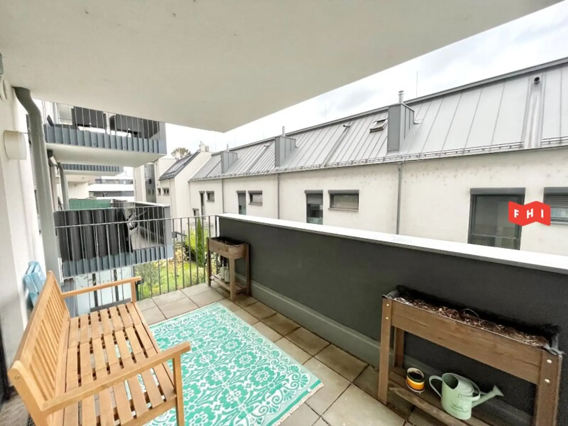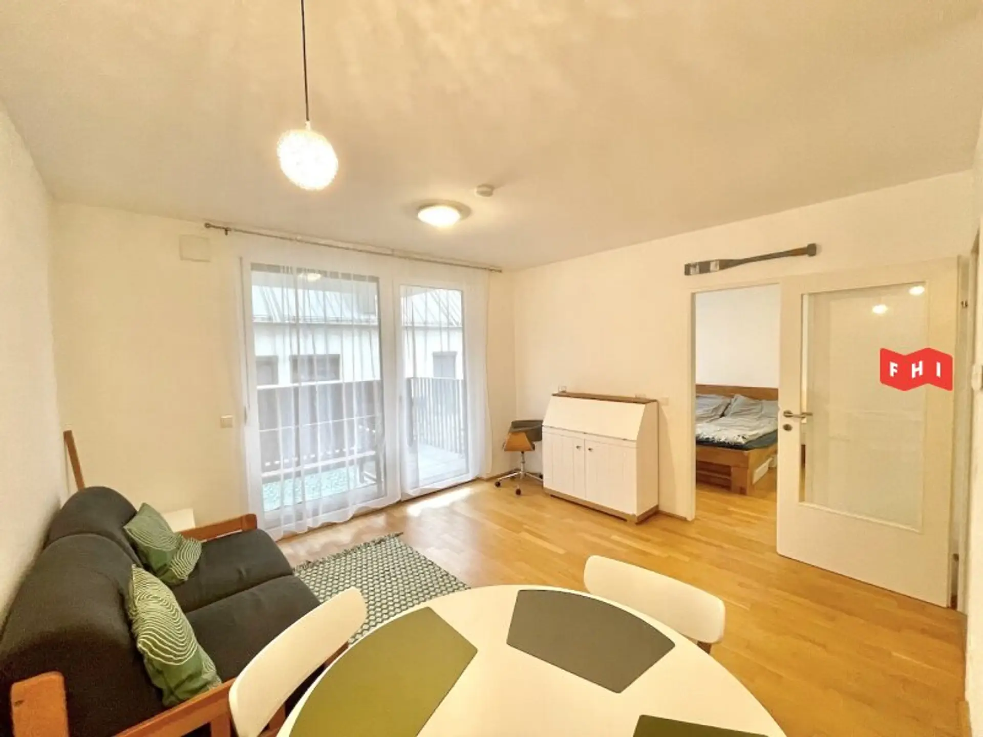 Vorraum, geräumiges Wohnzimmer mit offenem Küchenbereich, ca. 8,8m² Balkon, Schlafzimmer, Einbauküche, Fliesenbad mit Wanne und Waschmaschinenanschluss, separates WC.