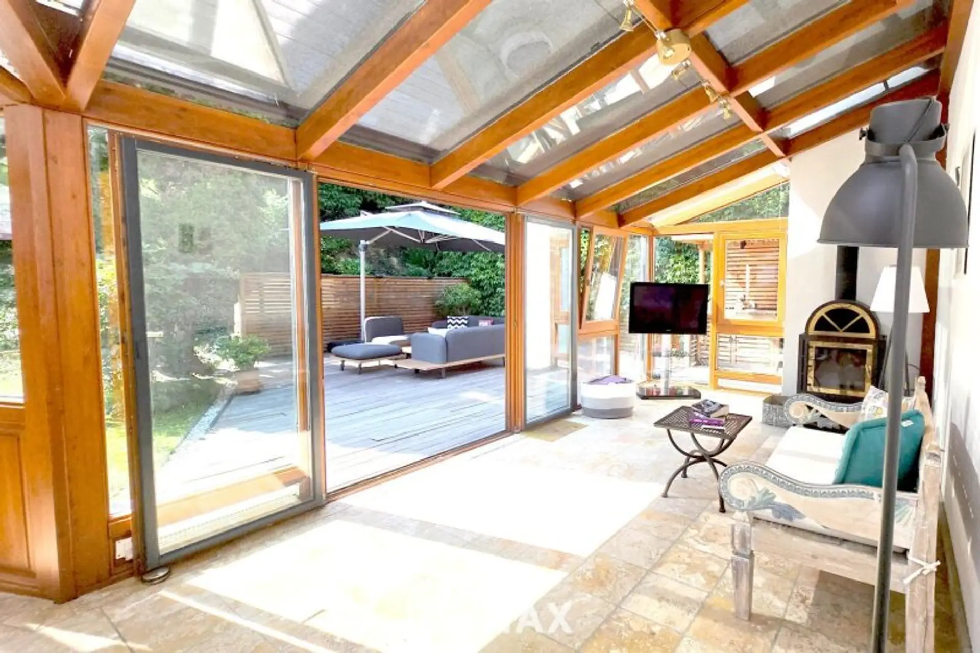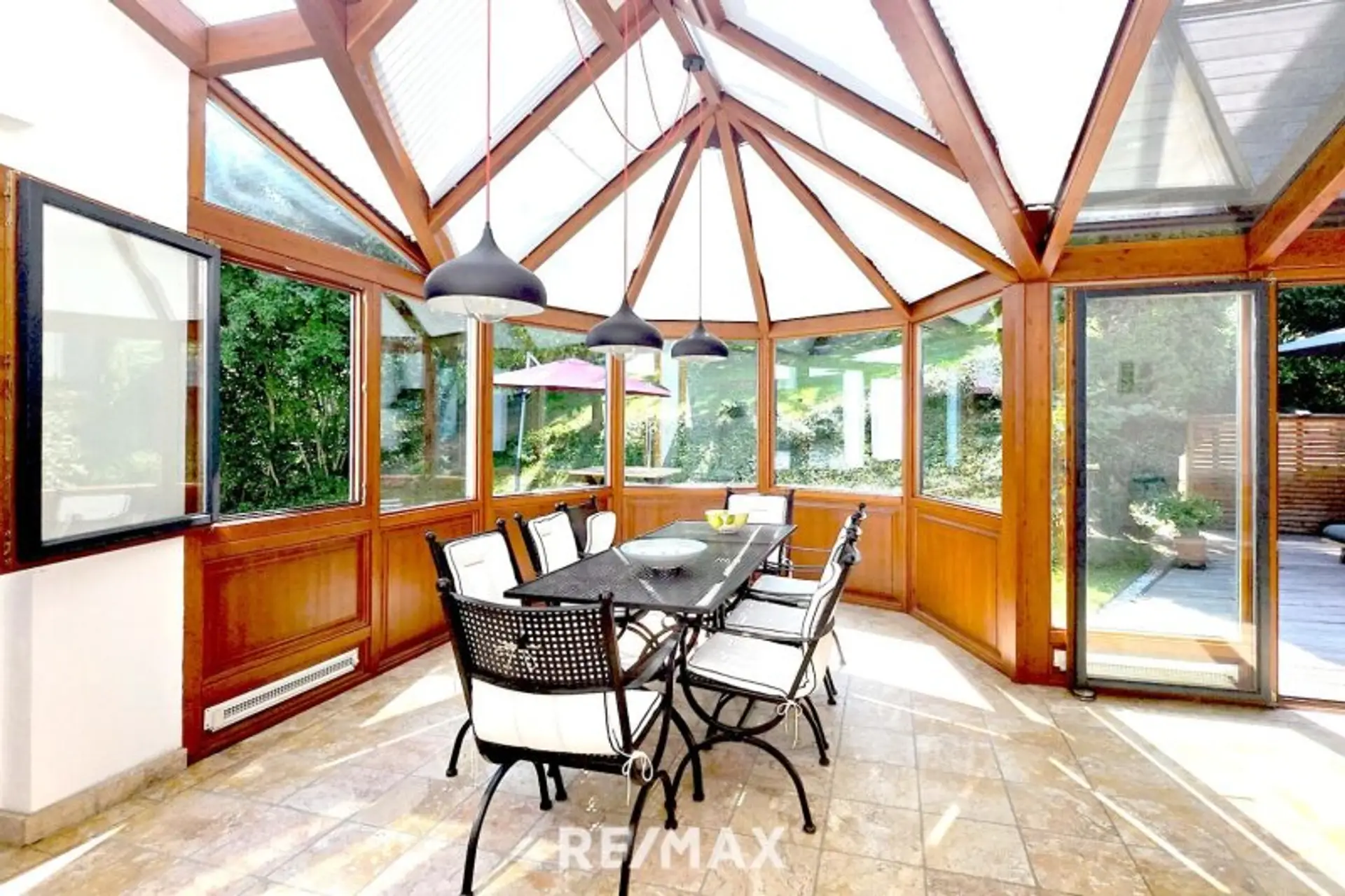 Zugang zum hellen Wintergarten mit Schwedenofen, Fußbodenheizung und Markise