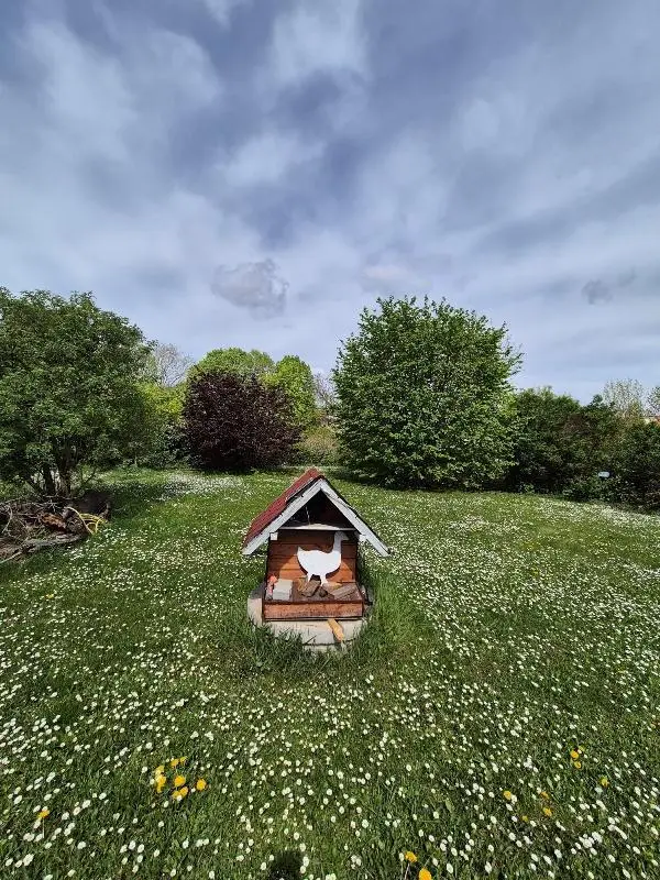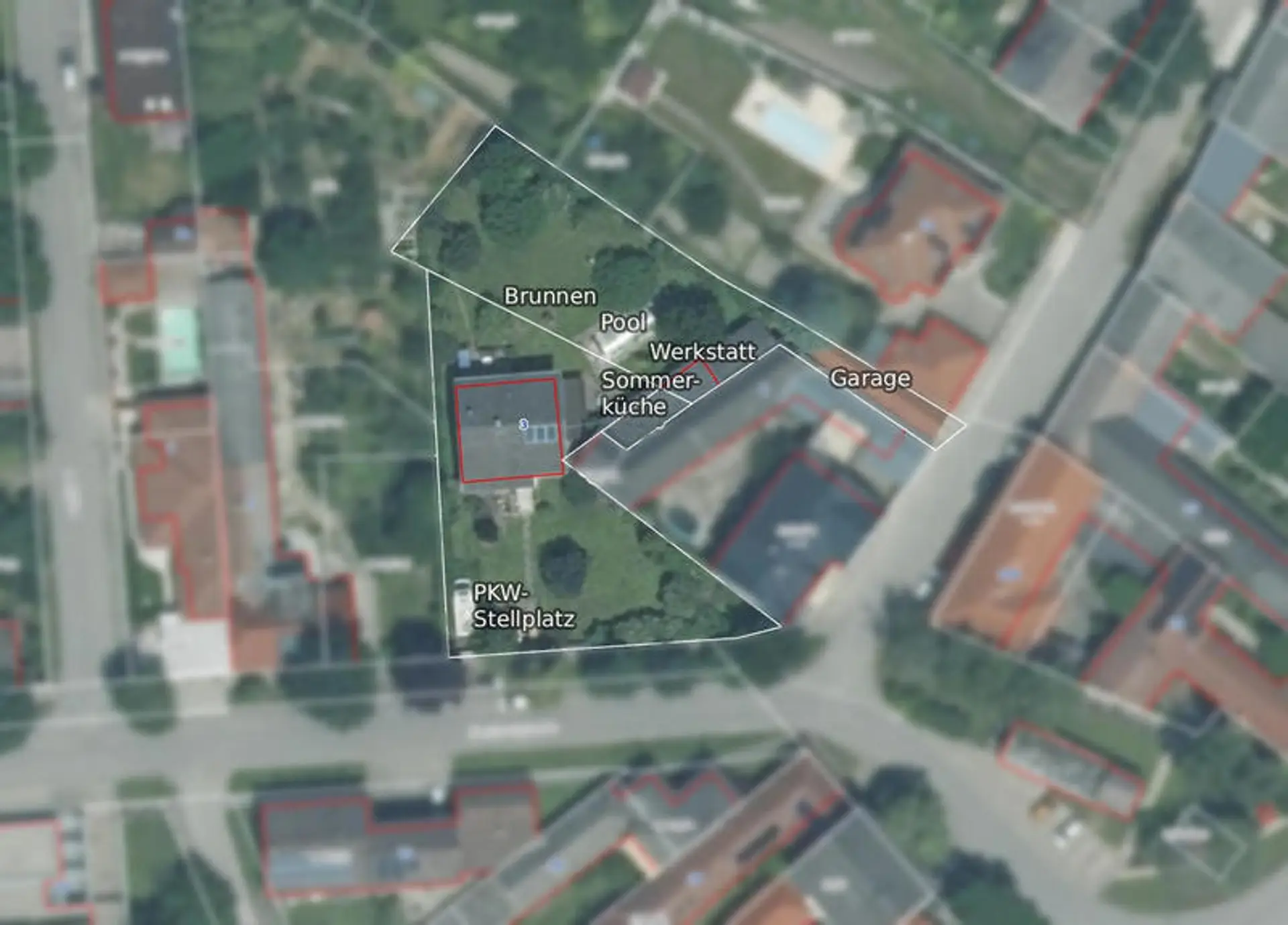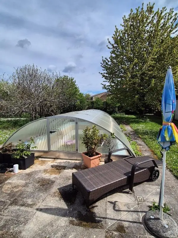 Der Außenbereich lässt absolute keine Wünsche offen. Ein überdachter Swimmingpool (3,5 x 6 m) sorgt für Abkühlung an heißen Tagen. Die Pflege der Grünanlagen gestaltet sich dank eines privaten, geschlagenen Trinkwasserbrunnens sehr kostengünstig. Dieser fördert Grundwasser aus geringer Tiefe und speist eine Sprinkleranlage, für die im gesamten Garten Anschlüsse verteilt sind. Zudem ist das Grundstück rundum mit Stromkabeln erschlossen.