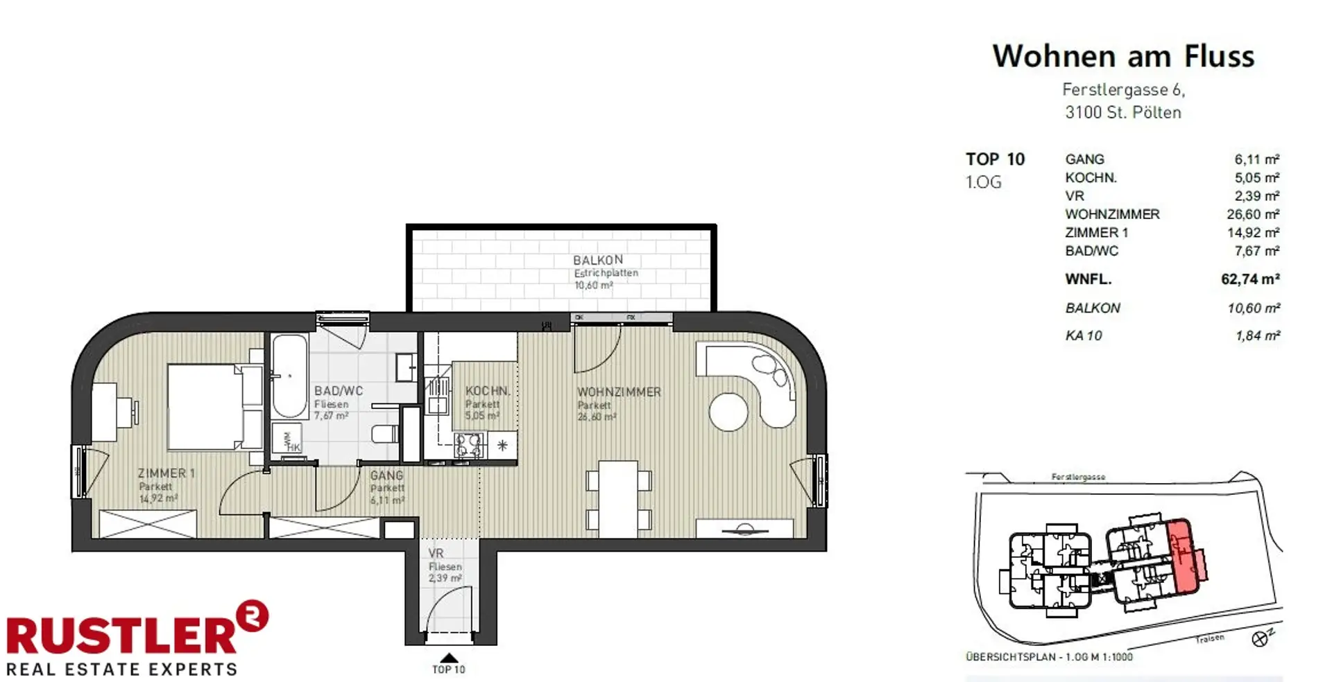 Willkommen in Traisen Living – einer modernen Wohnhausanlage in attraktiver Lage von St. Pölten! Die Wohnhausanlage in der Ferstlergasse umfasst 25 hochwertig ausgestattete Eigentumswohnungen und ist sofort bezugsfertig – ideal für alle, die ein besonderes Zuhause suchen, das stilvolles Wohnen mit der Nähe zur Natur verbindet. Direkt am Ufer der Traisen gelegen, vereint Traisen Living modernes Wohnen mit naturnahem Lebensgefühl. Genießen Sie die ruhige Lage am Wasser, umgeben von viel Grün, und profitieren Sie gleichzeitig von der hervorragenden Anbindung an das Stadtzentrum von St. Pölten. Hier wohnen Sie in einem Zuhause, das jeden Tag Erholung und Lebensqualität schenkt. Ihre Wohnhighlights auf einen Blick: 25 Wohnungen mit 2 bis 4 Zimmern Wohnflächen von 56 bis 123 m² Eigengärten, Balkone oder Terrassen für Ihr persönliches Freiluft-Wohngefühl Tiefgarage mit 25 Stellplätzen und Kellerabteil für jede Wohnung Erstbezug – sofort einziehen und wohlfühlen Ausstattung, die begeistert: Massivbauweise mit Vollwärmeschutzfassade 3-fach verglaste Kunststoff-Alu-Fenster mit außenliegendem Sonnenschutz Hochwertige Parkettböden in Wohnräumen, Feinsteinzeug-Fliesen in Bädern und WCs Brunnen-Wärmepumpe mit Bauteilaktivierung für energieeffiziente Heizung PV-Anlage zur Unterstützung der Wärmepumpe und Allgemeinstromversorgung Vorbereitung für E-Ladestationen in der Tiefgarage Elektrische Handtuchheizkörper in den Bädern Frostsichere Wasseranschlüsse und Steckdosen auf Balkonen und Terrassen Spielplatz und begrünte Außenanlagen für Familien und Kinder Lage, die überzeugt: Die Ferstlergasse bietet eine attraktive Wohnlage mit idealer Anbindung und umfassender Infrastruktur. In wenigen Minuten erreichen Sie das Zentrum von St. Pölten, den Hauptbahnhof sowie zahlreiche Einkaufs- und Freizeitmöglichkeiten. Für den täglichen Bedarf stehen Supermärkte, Bäckereien und Apotheken in unmittelbarer Umgebung zur Verfügung. Schulen, Kindergärten und medizinische Versorgung befinden sich ebenfalls in der Nähe. Die grünen Uferbereiche der Traisen direkt vor der Haustür laden zu Sport, Bewegung und Erholung ein – sei es beim Joggen, Spazieren oder Radfahren. In nur wenigen Gehminuten erreichen Sie außerdem den Traisenpark, einen der größten Einkaufszentren der Region. Für Pendler bietet die Nähe zur Westbahnstrecke und die gute Anbindung an die S33 und A1 Westautobahn eine schnelle Verbindung in Richtung Wien und Linz. Ein Garagenstellplatz kann für EUR 28.500.- erworben werden.