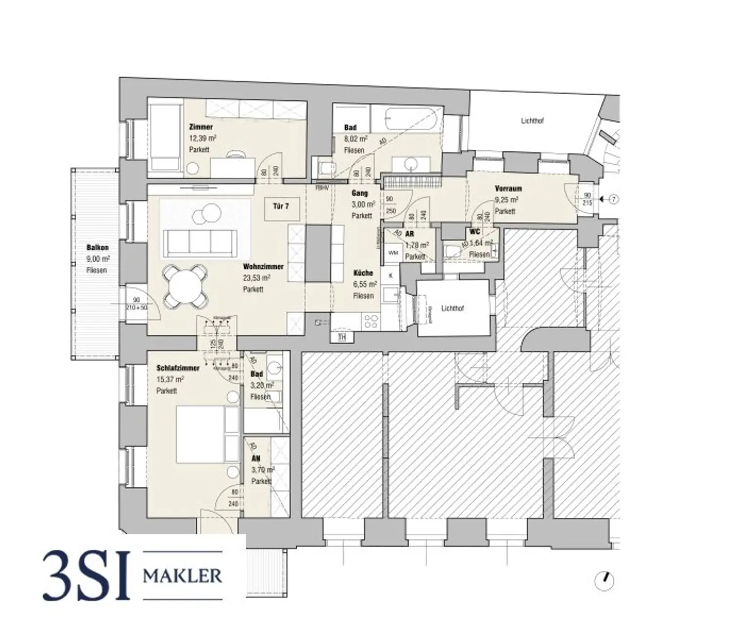 Großzügiger, lichtdurchfluteter Wohnbereich mit idealer Möblierbarkeit und edlem Parkettboden.