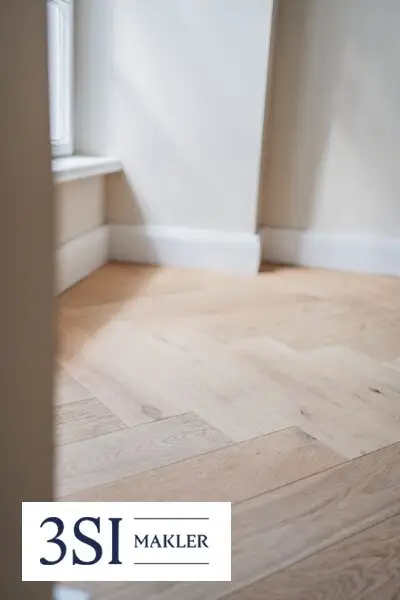 * Fischgrätparkett in Eiche, lebhaft astig, gebürstet, weiß geölt