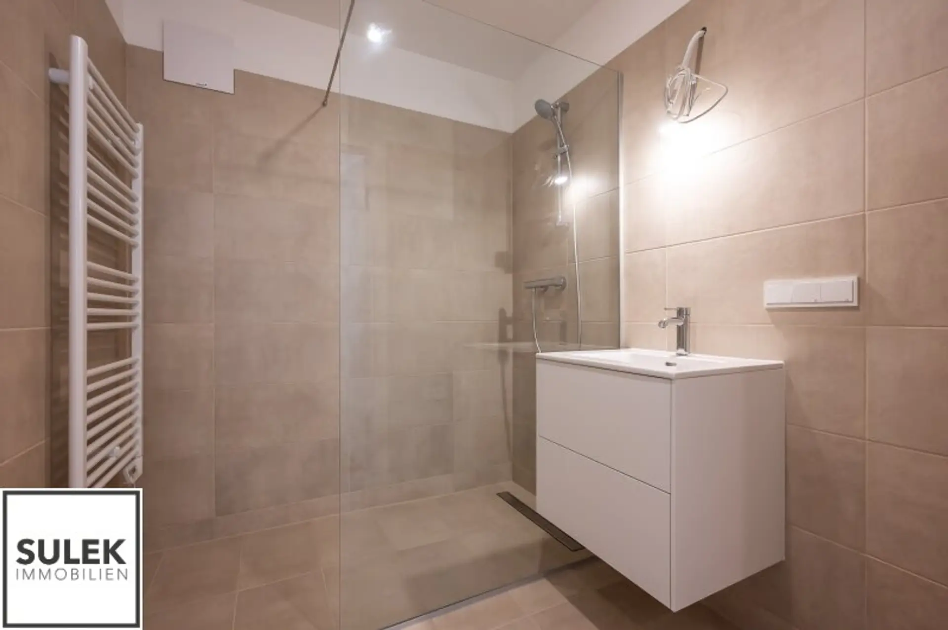 * ein modernes Badezimmer mit Walk In Dusche, einem Waschplatz, Handtuchheizkörper und Waschmaschinen Anschluss (Unterbauschrank / Spiegelschrank / Waschmaschine / Trockner der Marke Samsung werden vom Vermieter zur Verfügung gestellt)