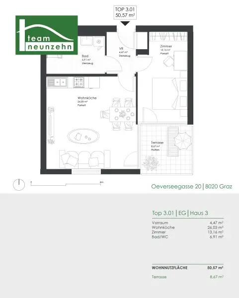 Die 2-Zimmer-Wohnung mit ca. 50,57 m² Wohnfläche zzgl. ca. 8,67 m² Terrasse gliedert sich in folgende Raumaufteilung:
