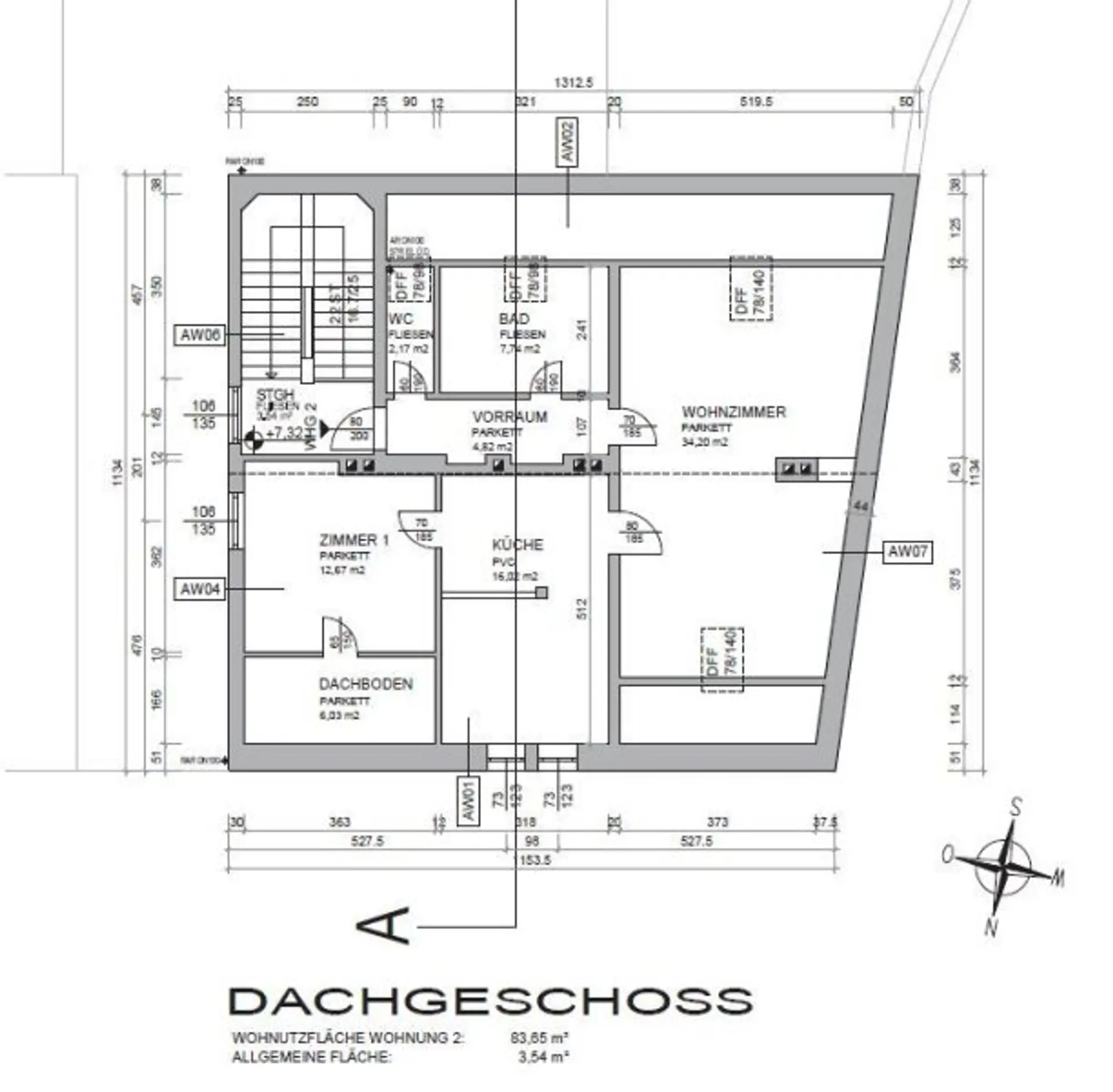 * Fläche: ca. 83,65 m² – auf einer Ebene im Dachgeschoß, das keine Aufzuganbindung hat - 2. Stockwerk