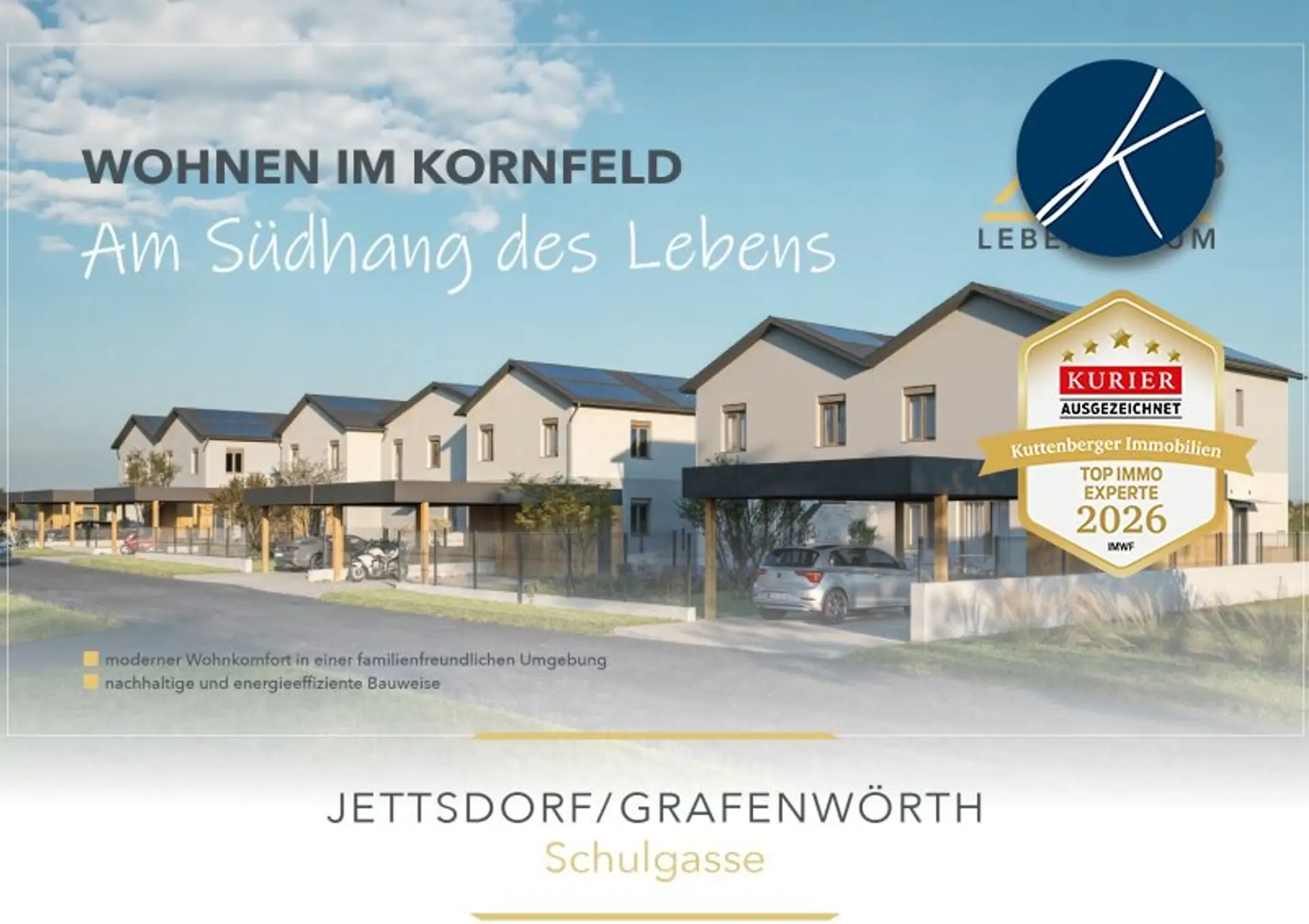 „Wohnen im Kornfeld“ steht für modernes, nachhaltiges Wohnen in einer lebenswerten Region – ein Zuhause, das Ruhe, Natur und zeitgemäßen Wohnkomfort harmonisch miteinander verbindet.