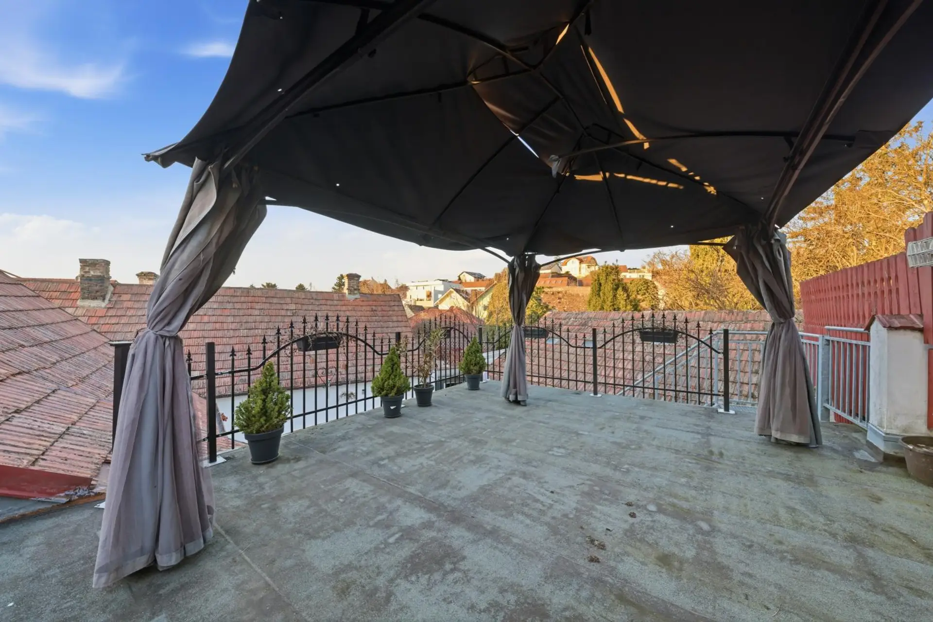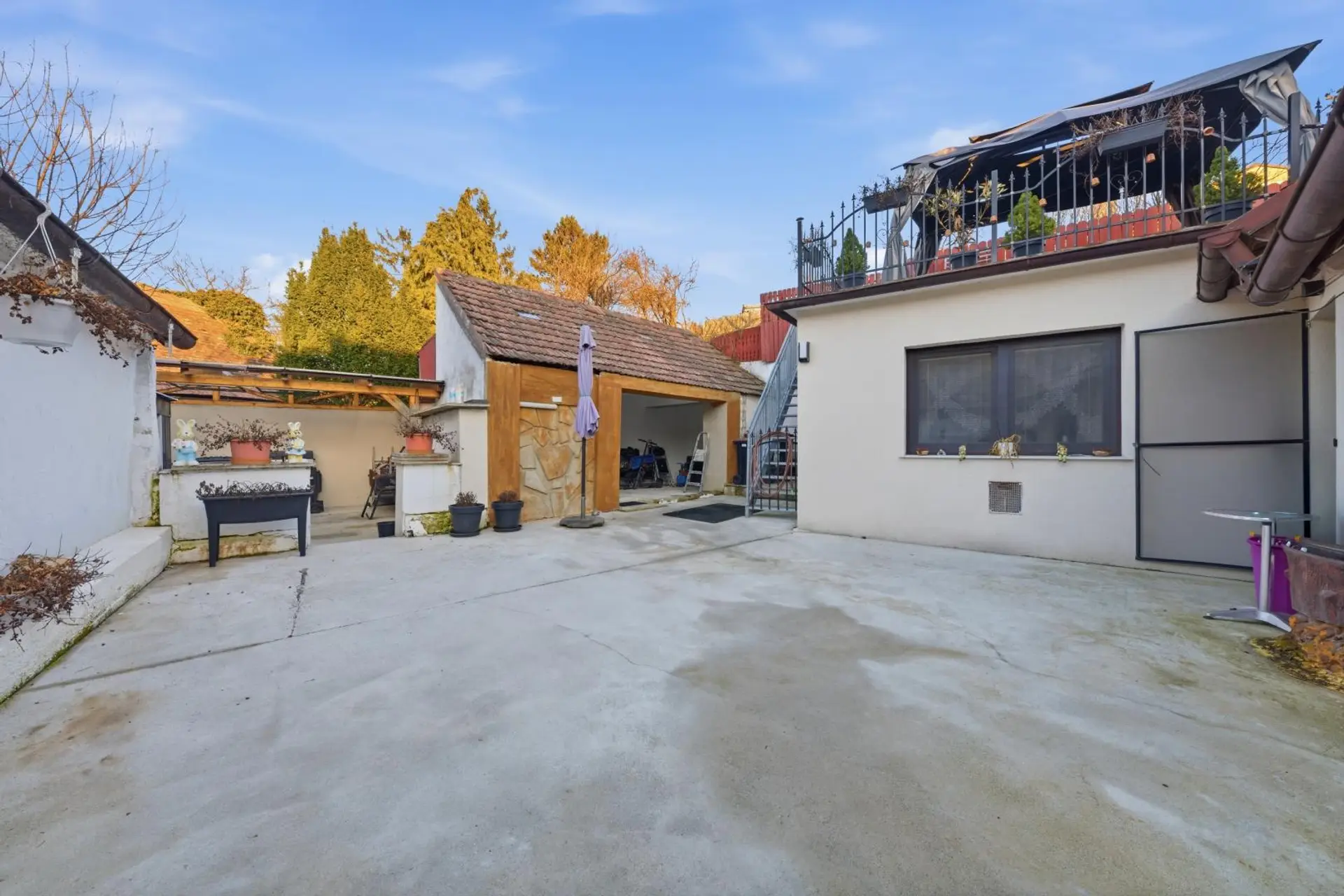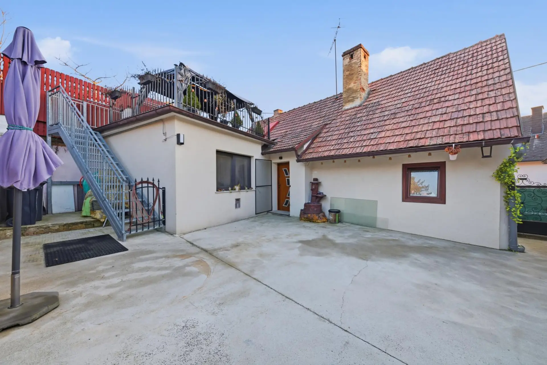 Der geschützte Innenhof sorgt für Privatsphäre und lädt zu entspannten Stunden im Freien ein. Besonders in den warmen Monaten eignet sich dieser Bereich hervorragend für gesellige Grillabende. Auf der Dachterrasse lassen sich zudem stimmungsvolle Sonnenuntergänge genießen. Die Raumaufteilung des Hauses ist durchdacht und funktional gestaltet. Auf einer Ebene befinden sich ein Vorraum, eine Küche mit Essbereich, ein Wohnzimmer, ein Badezimmer mit Toilette, zwei Schlafzimmer sowie ein Abstellraum. Zusätzlich bietet eine großzügige Innenhofterrasse weiteren Platz zum Entspannen. Der romantisch gestaltete Innenhof rundet das angenehme Wohnambiente ab.
