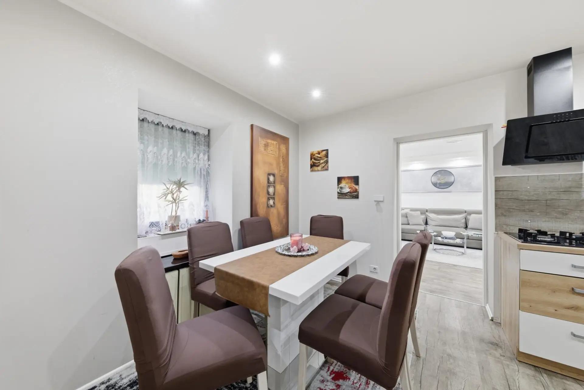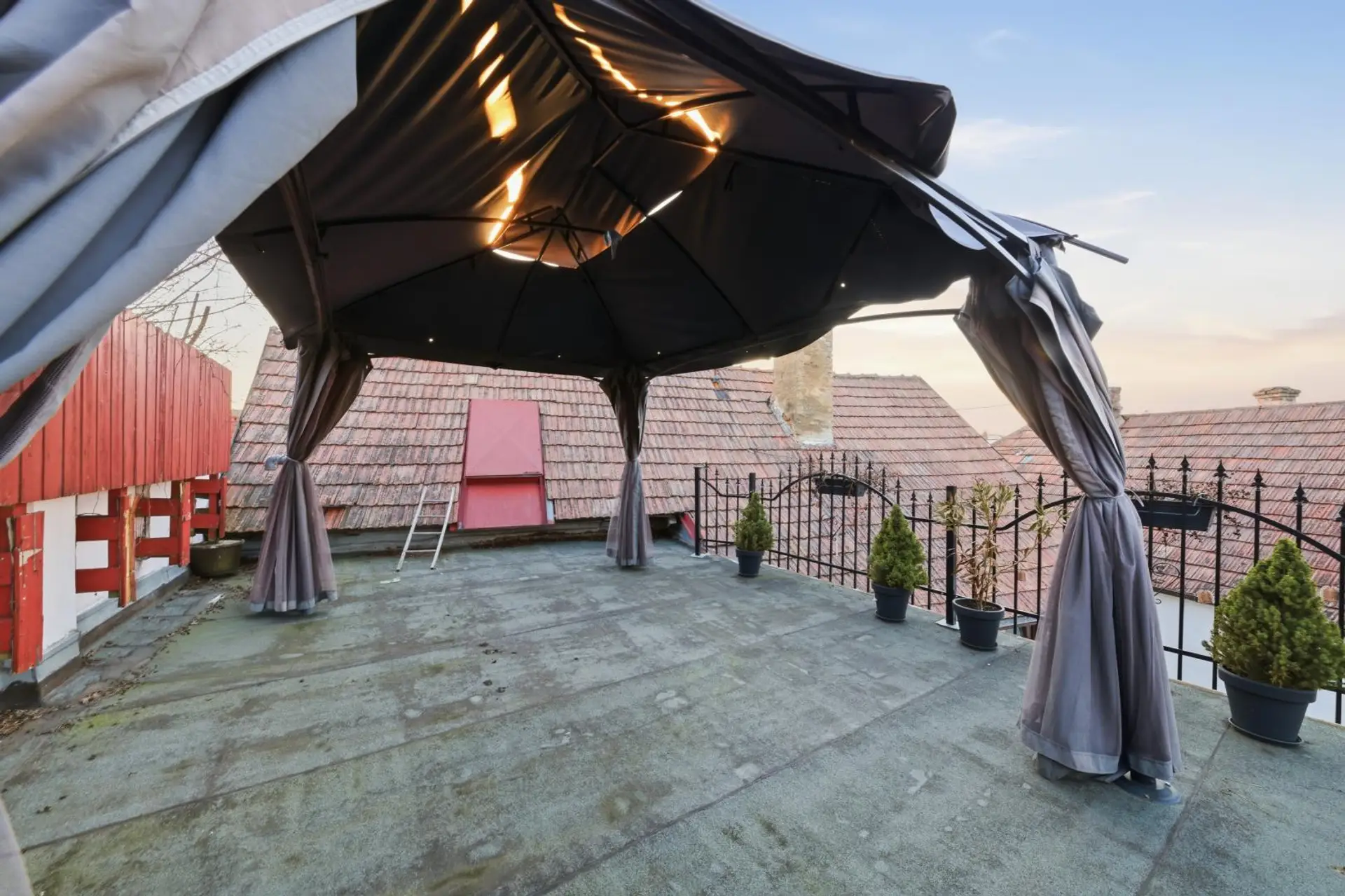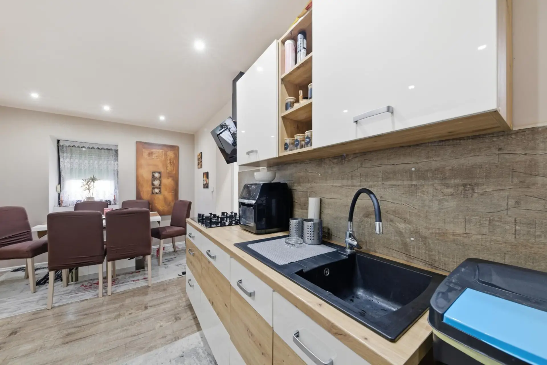 Der geschützte Innenhof sorgt für Privatsphäre und lädt zu entspannten Stunden im Freien ein. Besonders in den warmen Monaten eignet sich dieser Bereich hervorragend für gesellige Grillabende. Auf der Dachterrasse lassen sich zudem stimmungsvolle Sonnenuntergänge genießen. Die Raumaufteilung des Hauses ist durchdacht und funktional gestaltet. Auf einer Ebene befinden sich ein Vorraum, eine Küche mit Essbereich, ein Wohnzimmer, ein Badezimmer mit Toilette, zwei Schlafzimmer sowie ein Abstellraum. Zusätzlich bietet eine großzügige Innenhofterrasse weiteren Platz zum Entspannen. Der romantisch gestaltete Innenhof rundet das angenehme Wohnambiente ab.