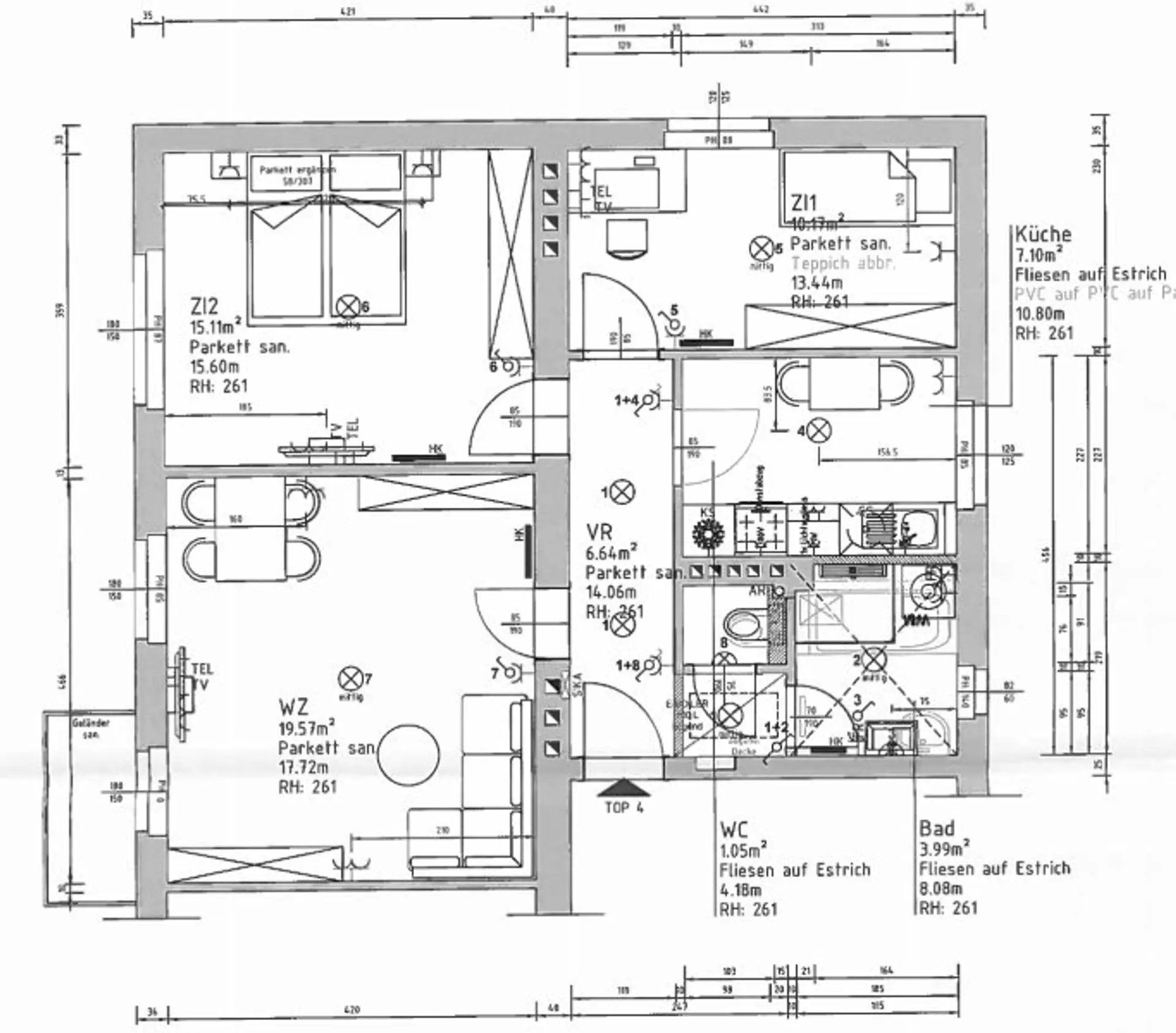 Ausstattung: sehr gut, Parkett- und Fliesenböden, Laminatböden und Komplettküche.