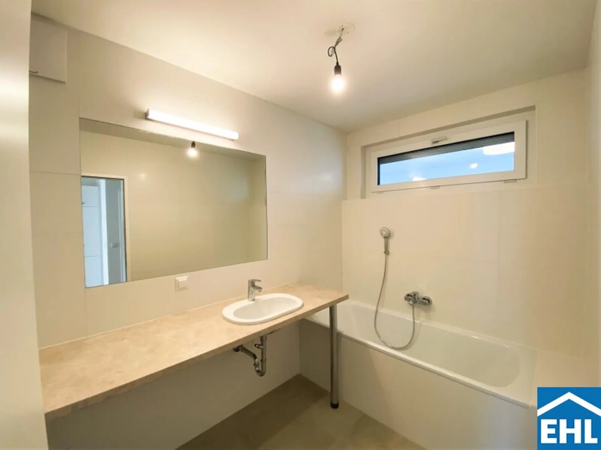 * Flächenbündiger Kristallspiegel im Bad über die Länge des Waschtisches