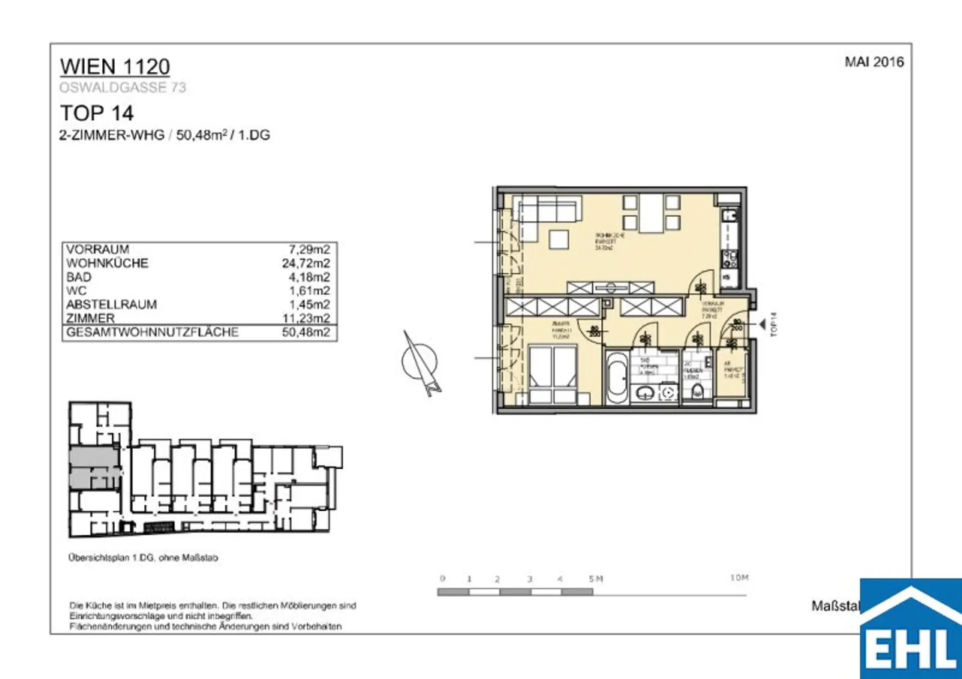 Die Wohnung selbst befindet sich im 1. Dachgeschoss und besteht aus einer geräumigen Wohnküche, ein Schlafzimmer, einem Badezimmer mit Badewanne, einer separaten Toilette, einem Abstellraum sowie einem Vorraum.