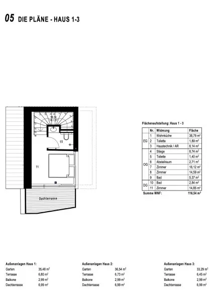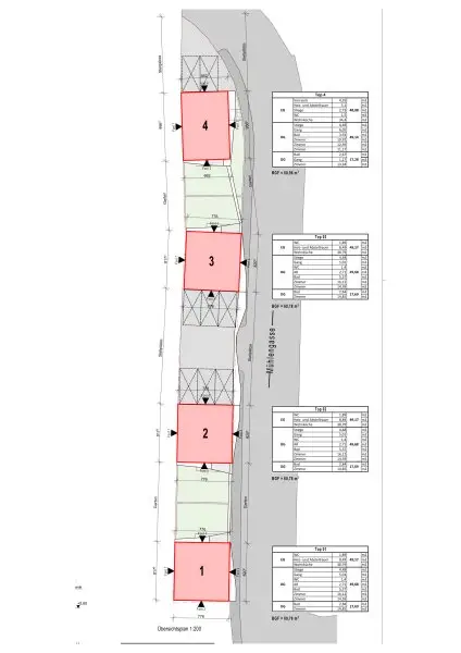 * Vier Einfamilienhäuser mit Garten, Terrassen und Dachterrassen