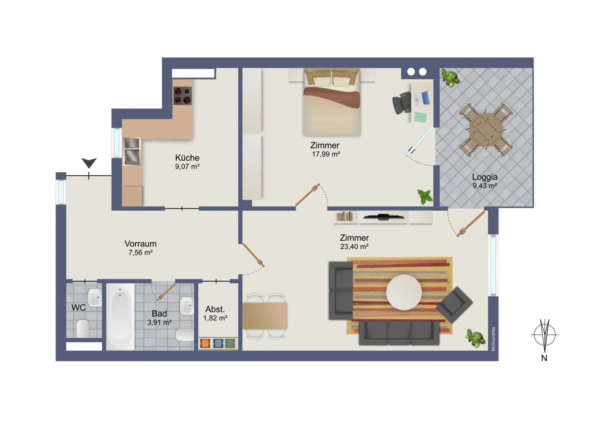 Die Wohnfläche beträgt ca. 65 m² und ist funktional aufgeteilt. Vom Vorraum aus sind ein Abstellraum, das Badezimmer mit Wanne sowie ein separates WC erreichbar. Weiters stehen ein helles Wohnzimmer, ein Schlafzimmer sowie eine separate Küche zur Verfügung. Sowohl das Wohn- als auch das Schlafzimmer bieten direkten Zugang zur westseitig ausgerichteten Loggia.