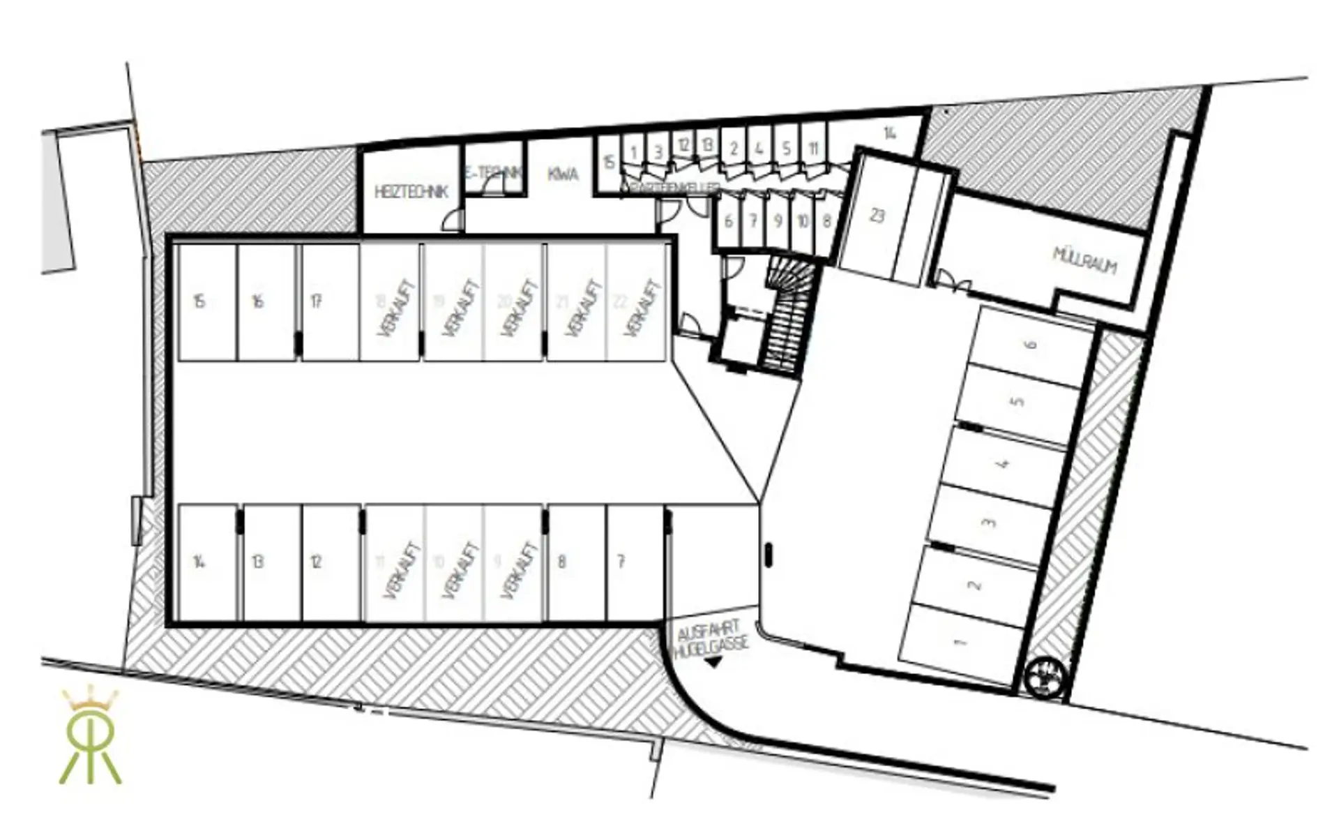Ein Tiefgaragenplatz mit der Nummer 23 (behindertengerecht) ist in der Miete inkludiert, ein zweiter kann optional angemietet werden.