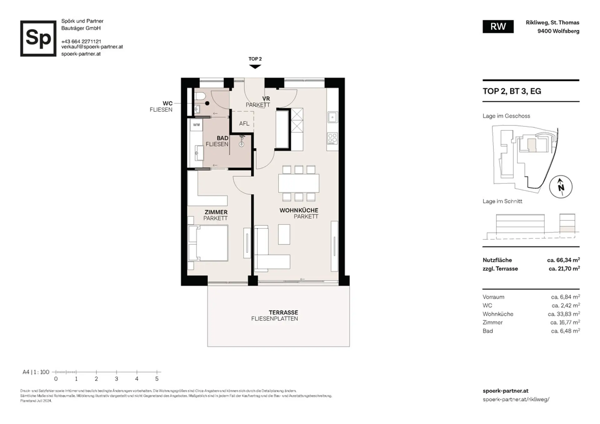Die 66,34 m² Wohnfläche sind klar strukturiert: ein ruhiges Schlafzimmer, ein modernes Bad, ein separates WC, ein funktionaler Vorraum und ein offener, ca. 33 m² großer Wohn-Ess-Bereich. Die Wohnung wirkt stimmig, hochwertig und alltagstauglich – ein Zuhause, das sofort vertraut wirkt.