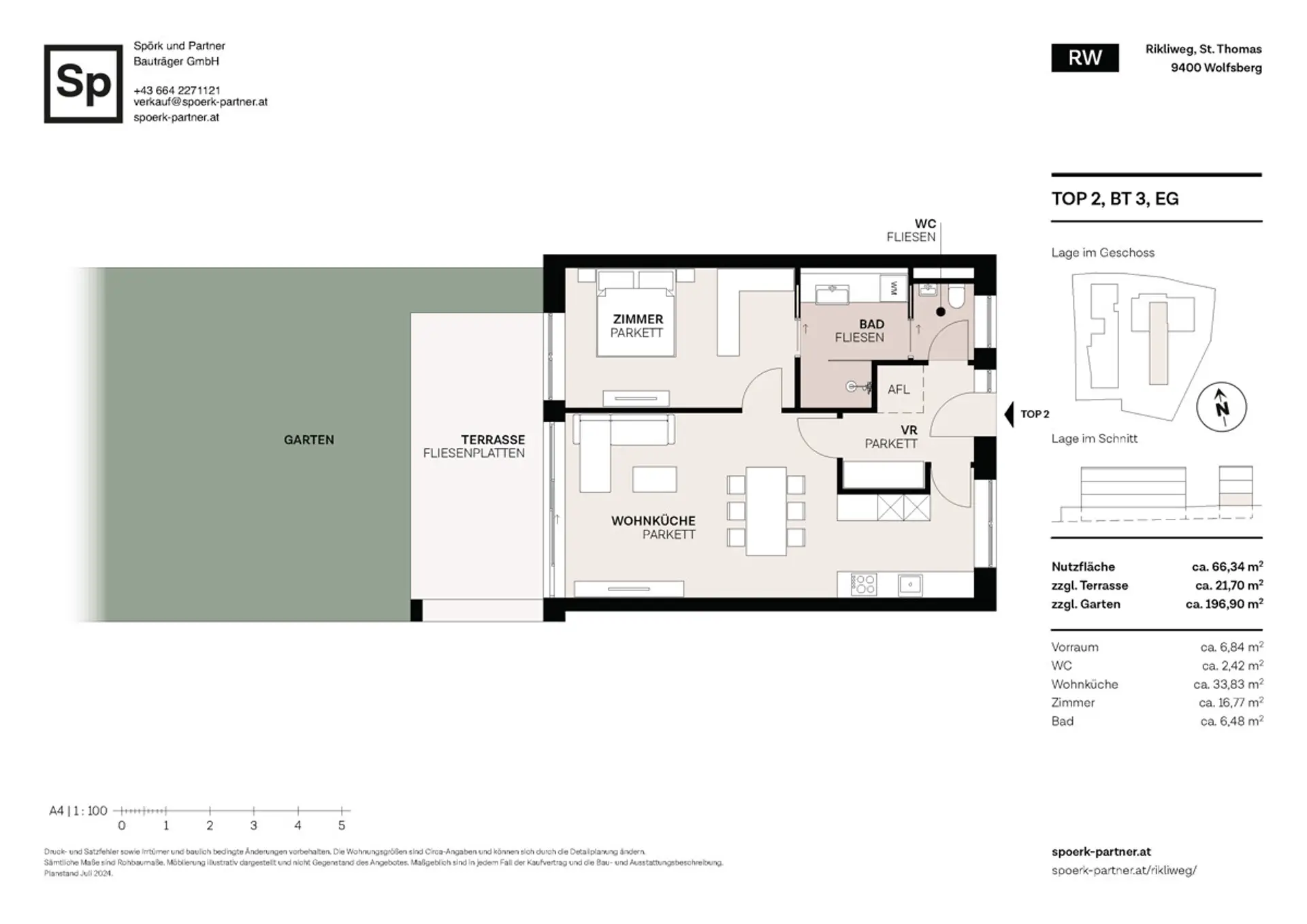 Am Rikliweg entsteht Wohnen, das berührt – und Wohnung 2 in Stiege 3 ist eine dieser Gartenwohnungen, die vom ersten Moment an eine warme, freundliche Atmosphäre erzeugen. Die Süd- und Südostausrichtung bringt ab dem Morgen viel weiches Licht in den Wohnbereich und lässt die Räume offen, hell und angenehm harmonisch wirken.