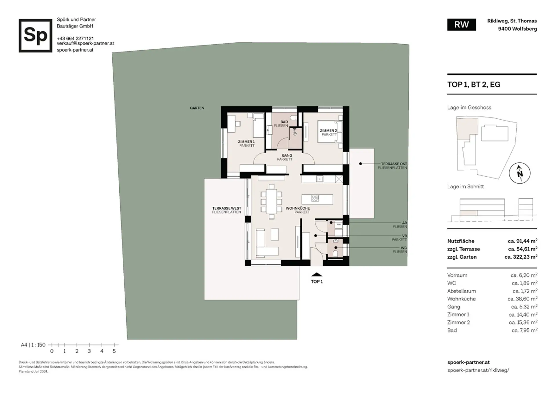 Am Rikliweg entsteht Wohnen, das berührt – und Wohnung 1 in Stiege 2 ist eine Gartenwohnung, die von Licht, Ruhe und einer außergewöhnlichen Großzügigkeit lebt. Die Süd- und Südostausrichtung lässt den 38,6 m² großen Wohn-Ess-Bereich vom frühen Morgen an in warmes, freundliches Sonnenlicht eintauchen. Die Räume wirken offen, einladend und voller Atmosphäre.