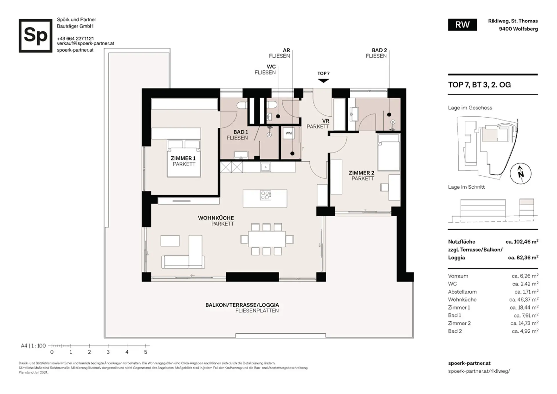 Am Rikliweg entsteht Wohnen, das berührt – und Wohnung 7 in Stiege 3 ist ein Dachgeschoss, das dieses Versprechen auf eindrucksvolle Weise erfüllt. Mit 102,46 m² Wohnfläche und einer riesigen 82,36 m² Dachterrasse entsteht ein Zuhause, das sich nach Freiheit, Großzügigkeit und ganz viel Licht anfühlt.