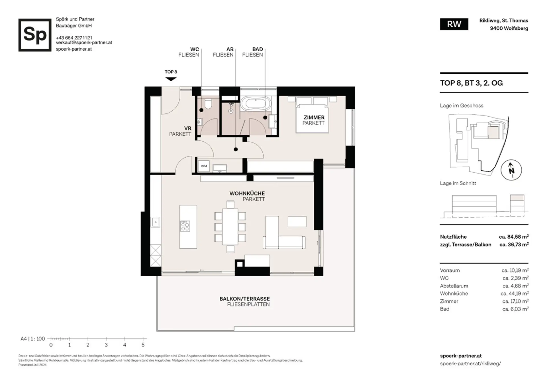 Am Rikliweg entsteht Wohnen, das berührt – und Wohnung 8 in Stiege 3 ist ein Dachgeschoss, das Leichtigkeit, Weite und bewusstes Wohnen auf den Punkt bringt. Auf 84,58 m² Wohnfläche entsteht ein klarer 3-Zimmer-Grundriss: ideal für Paare mit Platzbedarf, kleine Familien oder Menschen, die einen lichtdurchfluteten Zweitwohnsitz mit Qualität suchen.