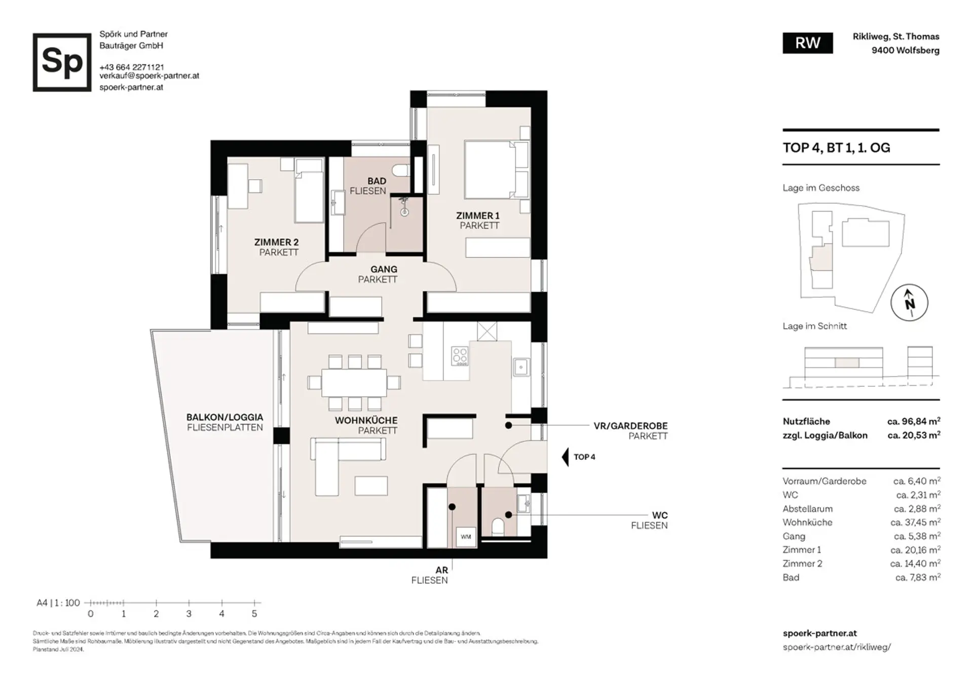 Die 96,84 m² Wohnfläche sind klar gegliedert: ein großes Hauptschlafzimmer, ein zweites helles Zimmer, ein hochwertiges Bad, separates WC, ein funktionaler Abstellraum und ein einladender Vorraum. Jeder Bereich ist logisch, hochwertig und auf Alltagstauglichkeit ausgelegt.