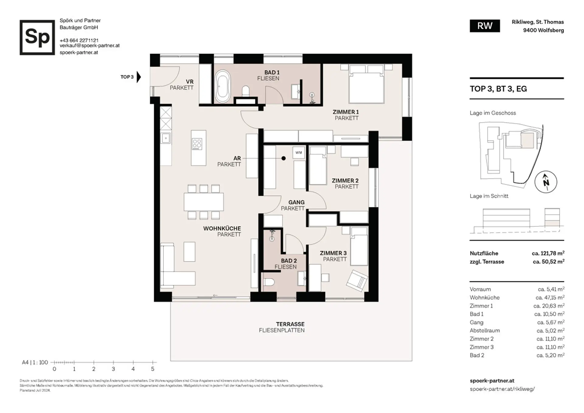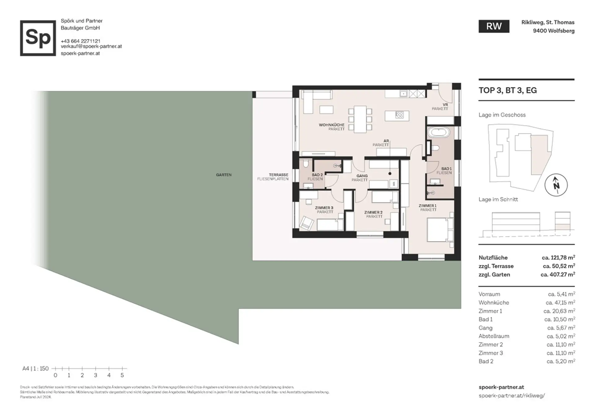Am Rikliweg entsteht Wohnen, das berührt – und Wohnung 3 in Stiege 3 ist eine jener großen Gartenwohnungen, die sofort das Gefühl vermitteln: Hier kann man bleiben. Auf 121,78 m² Wohnfläche entsteht ein großzügiger Familiengrundriss mit viel Platz, klaren Linien und einem starken Bezug ins Freie.