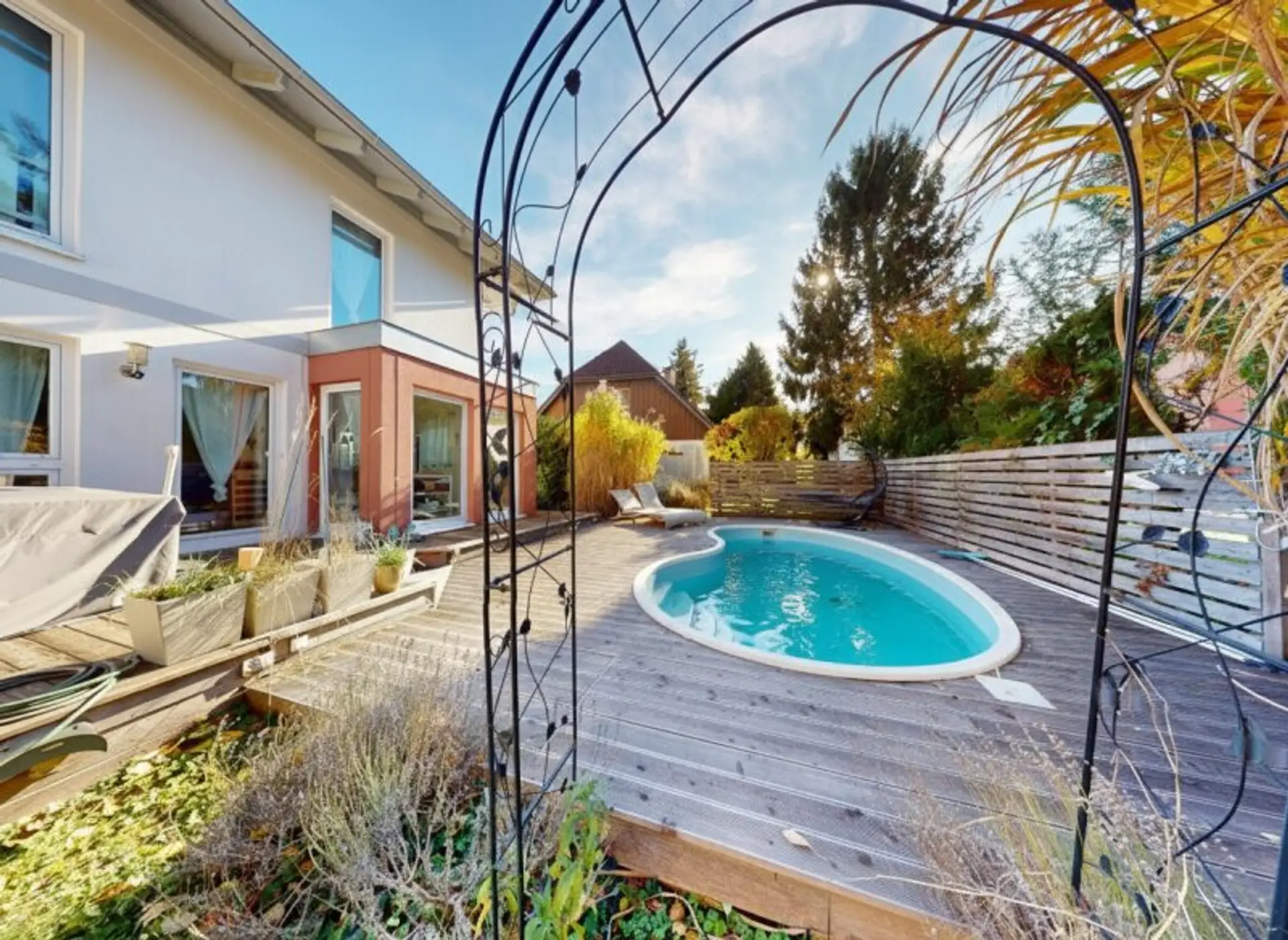 Der Garten mit Salzwasserpool und großzügiger Terrassenfläche für Sitzgruppe und Sonnenbetten hinter dem Haus ist ein verstecktes Paradies, das von der Straße aus nicht einsehbar ist.