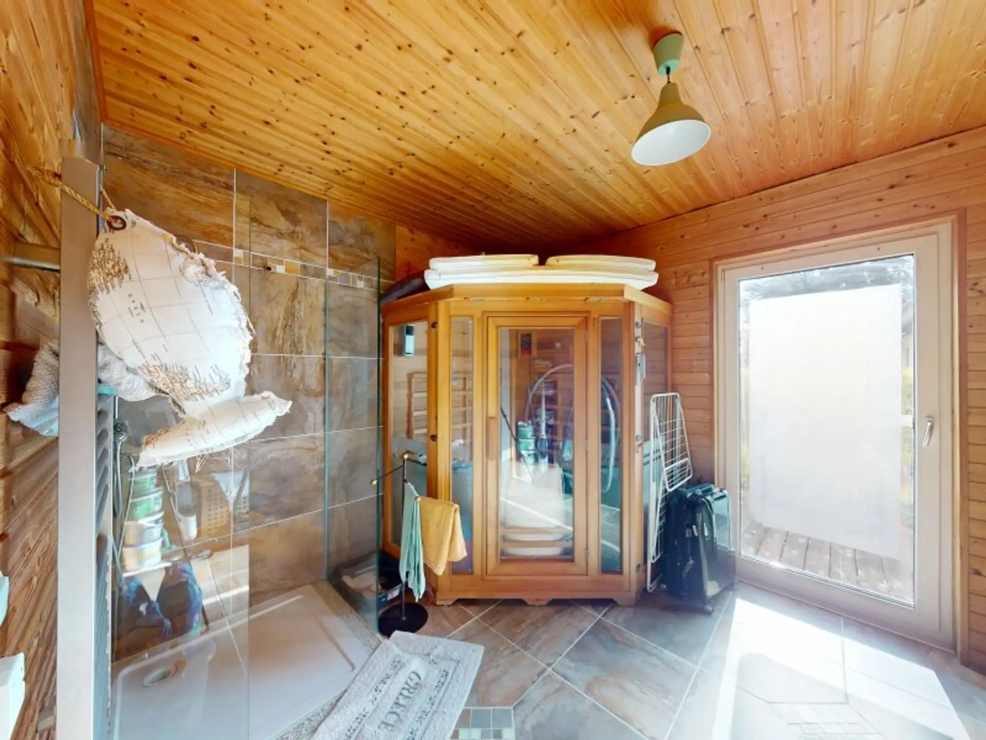 Das Haupthaus verfügt über zwei Geschoße mit insgesamt ca. 127m² Wohnfläche. Vorraum, Wohnküche (38,43m²), Sauna und Gäste-WC im Erdgeschoß, drei Schlafzimmer und ein Bad mit Wanne im Obergeschoß.