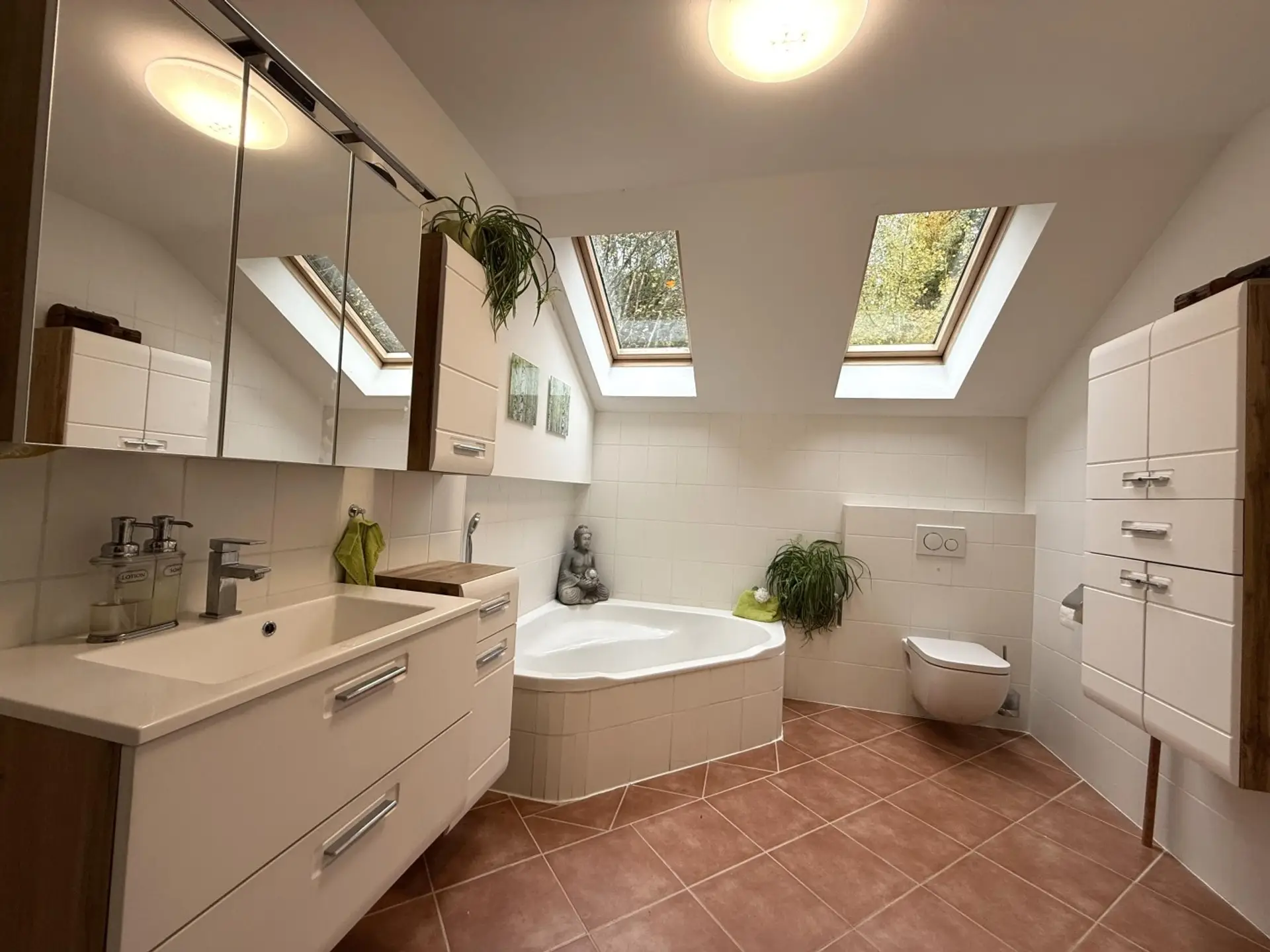Im Obergeschoss überzeugt das großzügige Badezimmer mit Dusche und Eckbadewanne – Ihr ganz persönlicher Rückzugsort zum Abschalten und Entspannen. Das Schlafzimmer begeistert mit einem traumhaften Panoramablick bis in die Berge, während ein weiteres Zimmer flexibel als Kinderzimmer, Büro oder Gästezimmer genutzt werden kann.