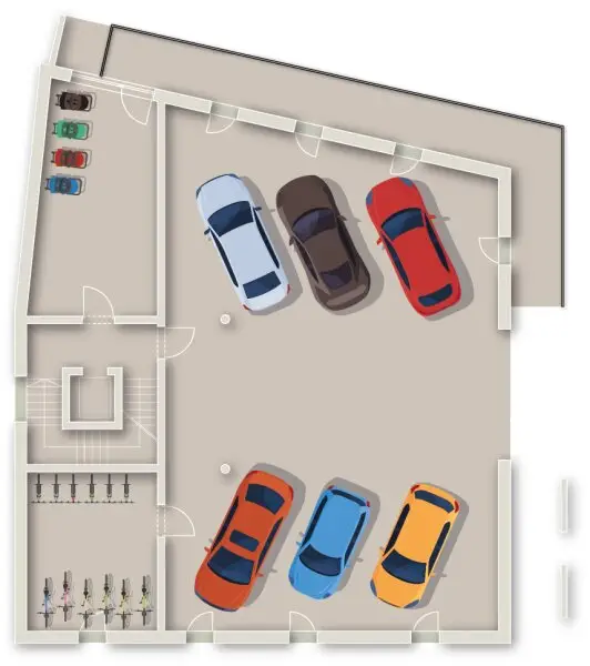 Praktische Aspekte wurden ebenso konsequent mitgedacht. Das Erdgeschoss verfügt über ein Parkdeck mit Garagenstellplätzen, einen überdachten Fahrradabstellbereich sowie einen Kinderwagenstellplatz mit direktem Hauszugang. Ein barrierefreier Zugang sorgt für Komfort im Alltag. Im Kellergeschoss stehen jeder Einheit eigene, absperrbare Kellerabteile zur Verfügung; zusätzlich sind ein Wasch- und Trockenraum sowie separat zugängliche Technik- und Müllräume vorgesehen.