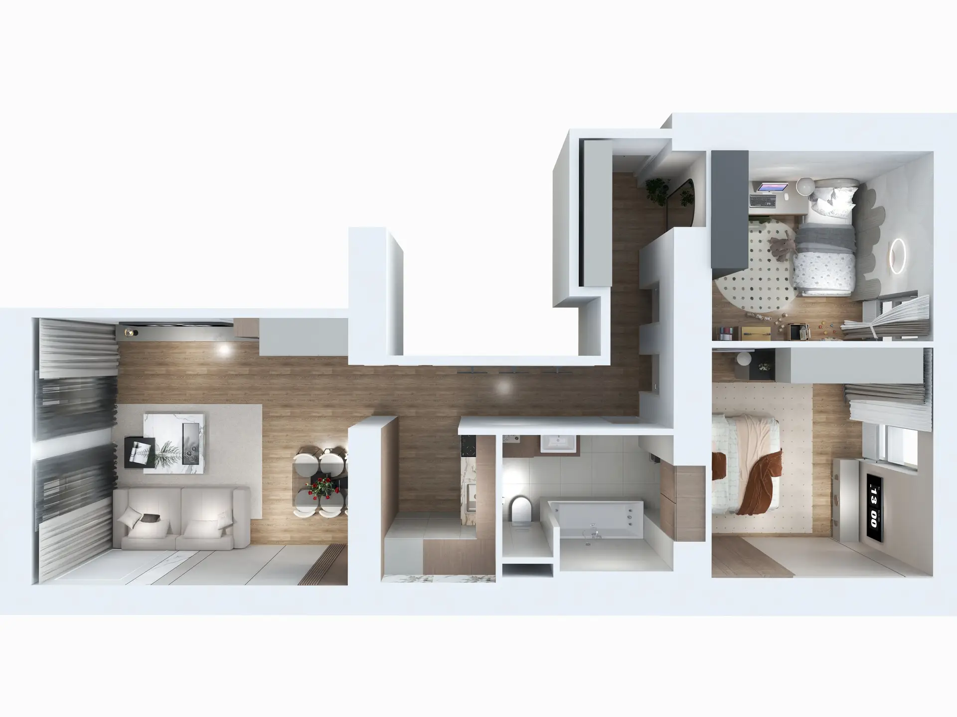 > Hochwertige Ausstattung, angefangen vom Holzdielenboden über Feinsteinzeugfliesen bis hin zu den ausgewählten Sanitäreinrichtungen