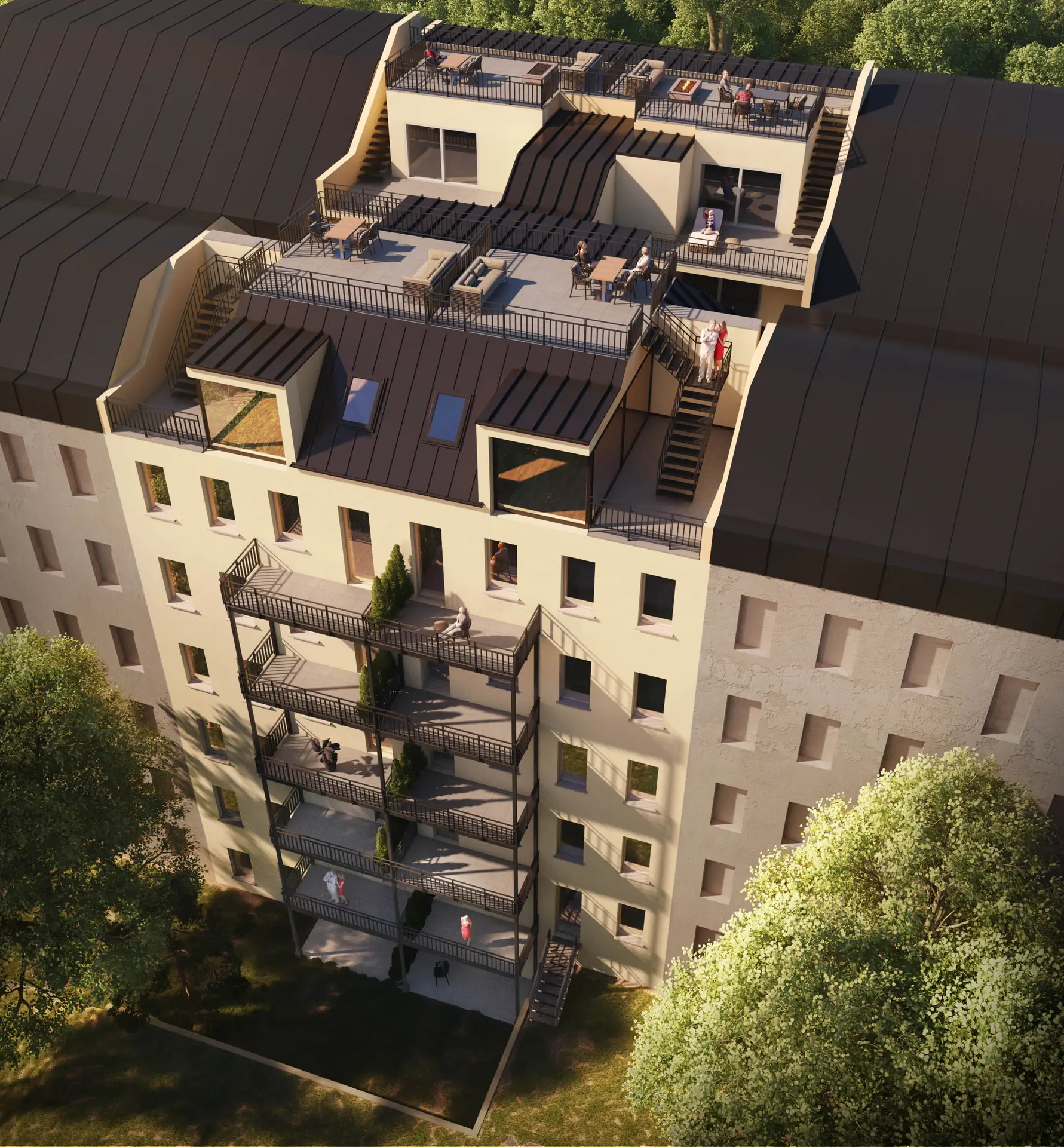 ➤ 12 hofseitige Altbauwohnungen mit eigenen Gärten oder Balkonen – grüne Rückzugsorte mitten in der Stadt.