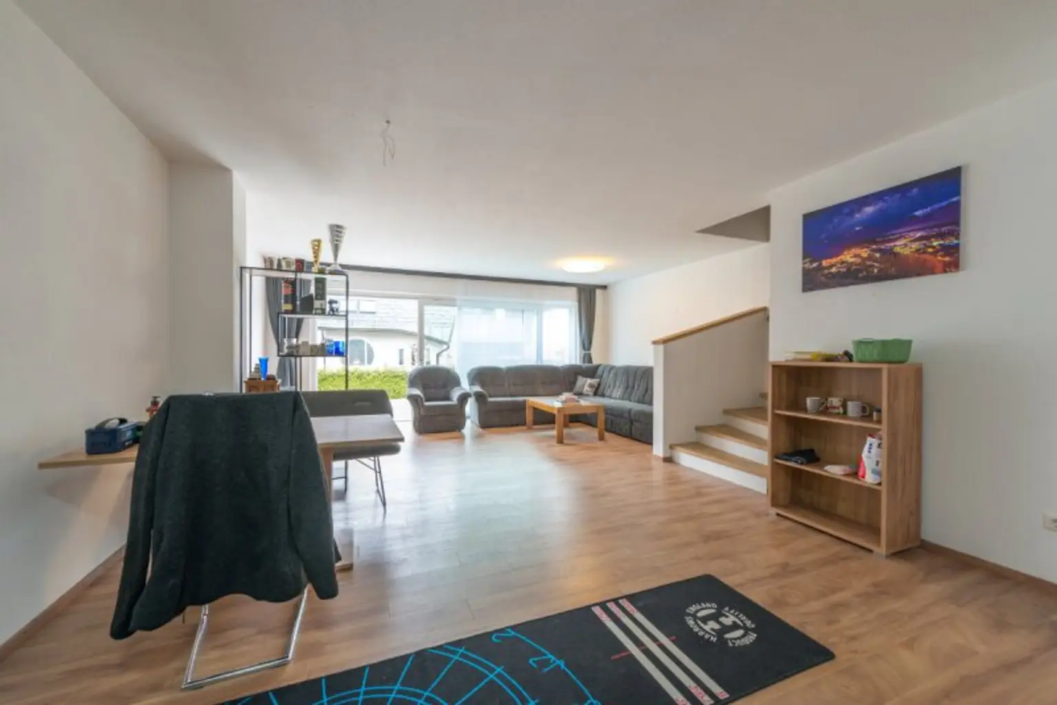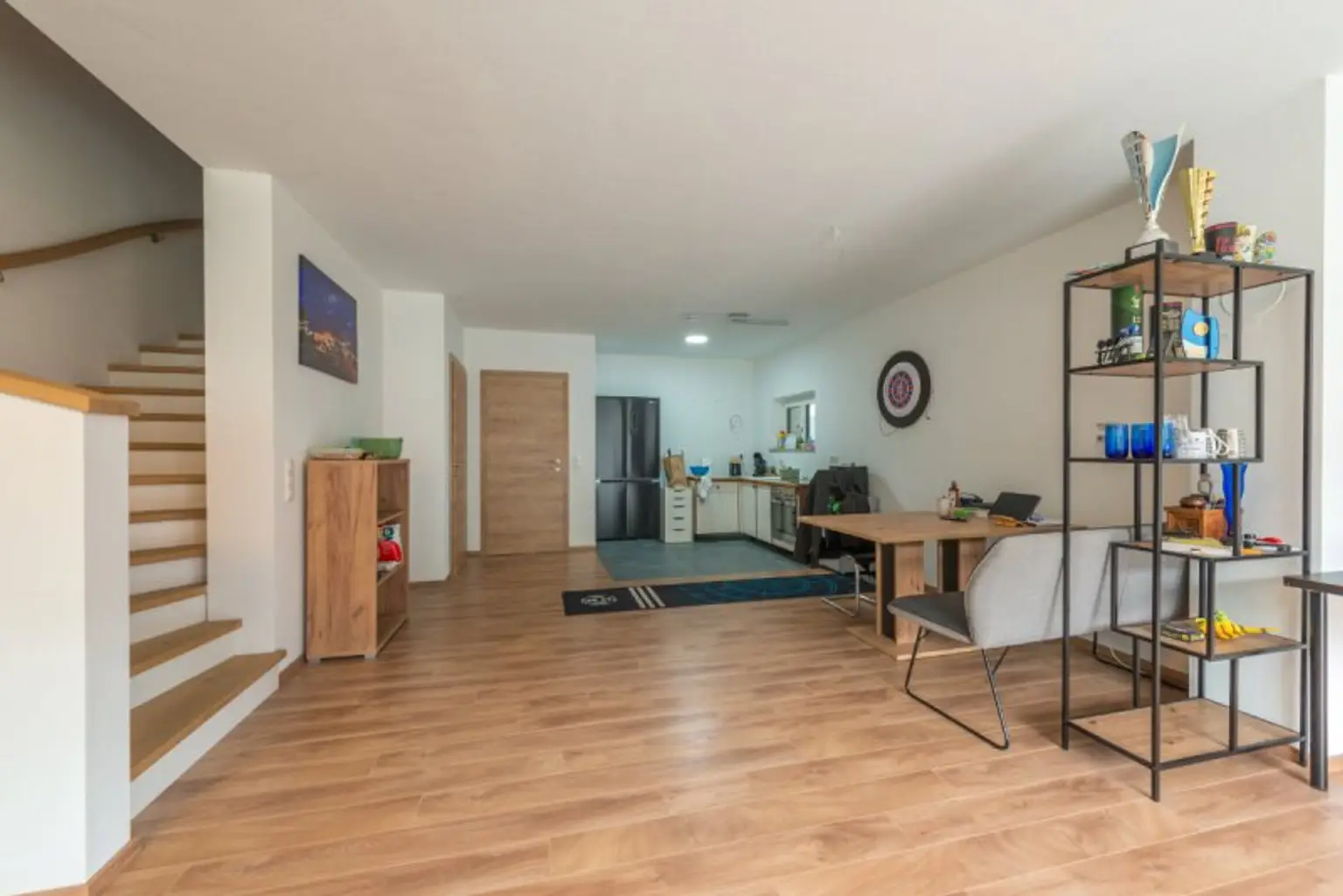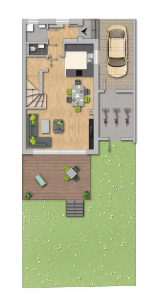 Das Erdgeschoss überzeugt mit einem lichtdurchfluteten Wohn- und Essbereich, der direkten Zugang zur sonnigen Terrasse und in den Garten bietet – ideal für entspannte Stunden oder gesellige Abende. Ergänzt wird diese Ebene durch ein separates WC, einen praktischen Abstellraum sowie einen Technikraum.