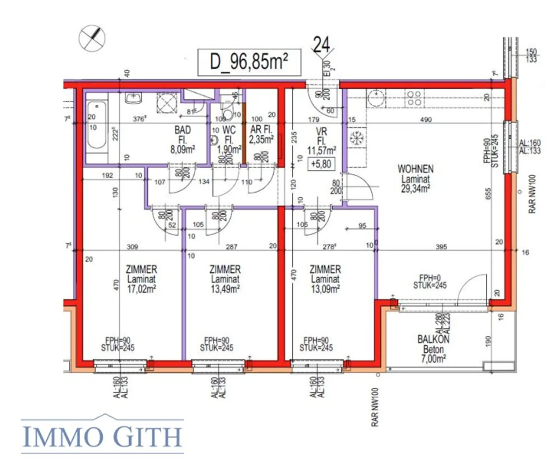 Drei gut geschnittene Zimmer mit rund 17,0 m², 13,5 m² und 13,1 m² lassen sich flexibel als Schlaf-, Kinder- oder Arbeitszimmer nutzen. Ein Badezimmer mit Badewanne, ein separates WC sowie ein praktischer Abstellraum sorgen für zusätzlichen Komfort. Der großzügige Vorraum verbindet alle Bereiche funktional und unterstreicht das angenehme Raumgefühl dieser Wohnung.