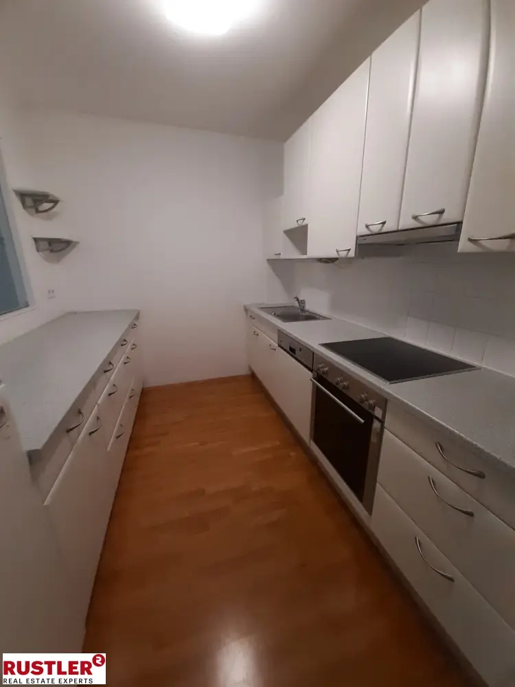 Der Wohnbereich ist durch die tiefen Fenster und dem im Eck angelegten Balkon lichtdurchflutet und grenzt an die Küche, welche mit allen Geräten ausgestattet ist.