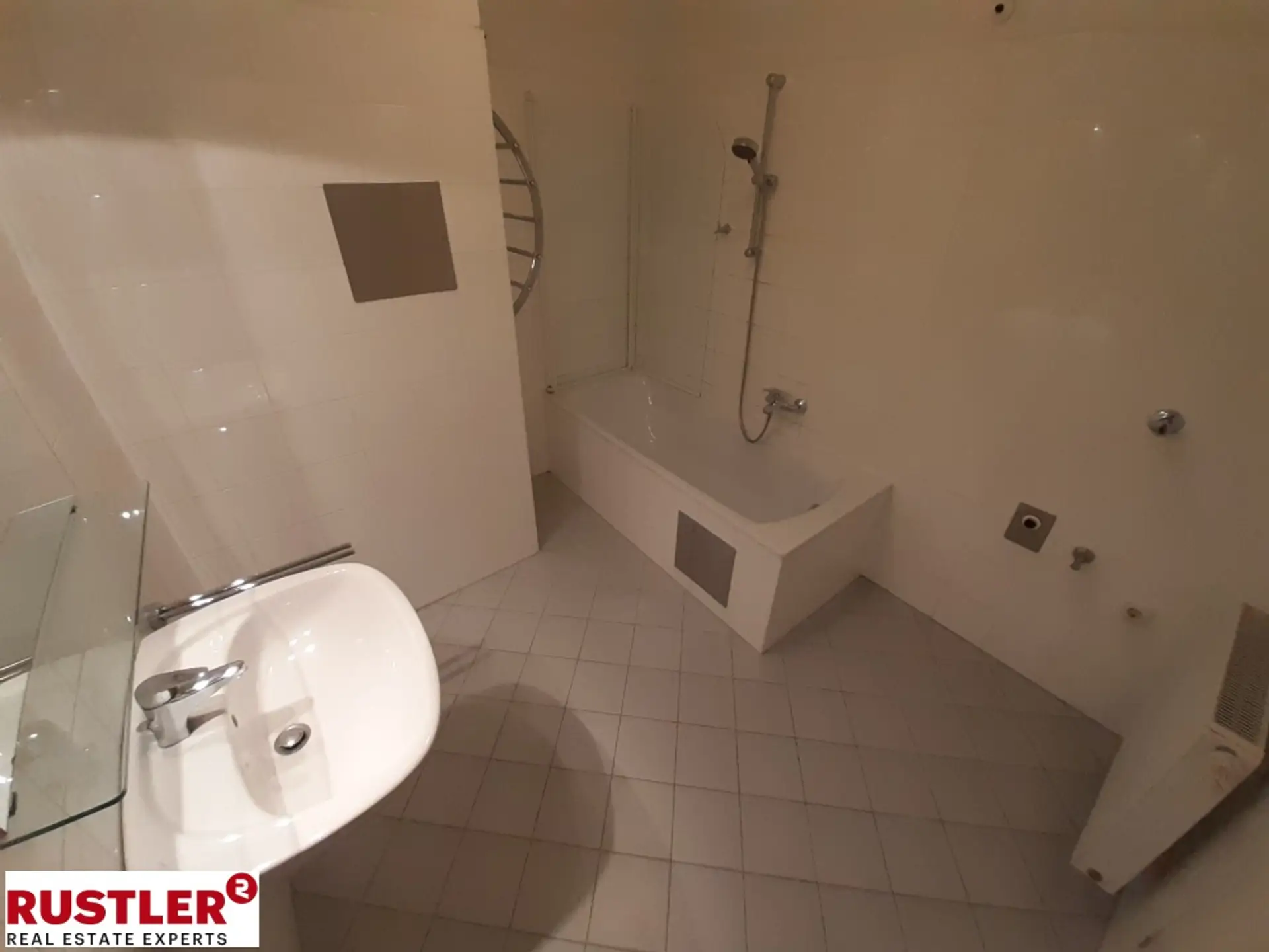 Das Badezimmer ist mit einer Badewanne, Waschbecken samt Armaturen und einem Waschmaschinenanschluss ausgestattet. Die Toilette ist separat.