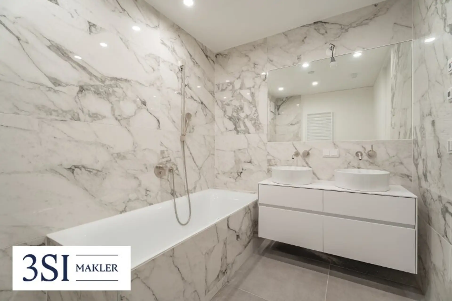 * Badezimmer mit Badewanne, zwei Handwaschbecken und Waschmaschinenanschluss (ca. 6,5 m²)