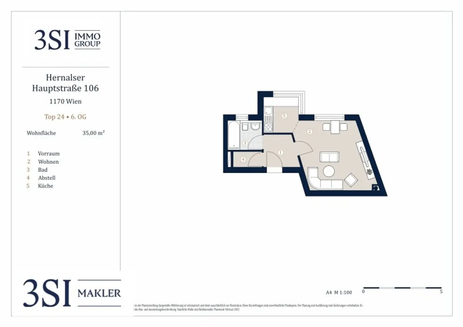 Diese sonnige, nur hofseitig ausgerichtete 1 Zimmer-Neubauwohnung liegt im 6. Liftstock und teilt sich wie folgt auf: