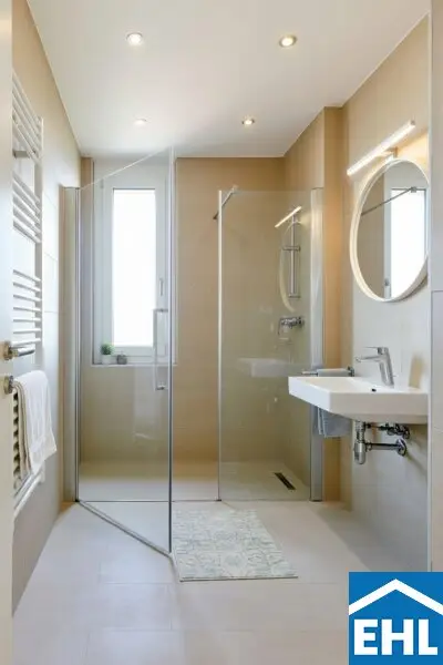 * Bodengleiche Dusche mit Linienablauf und Glasduschtrennwand