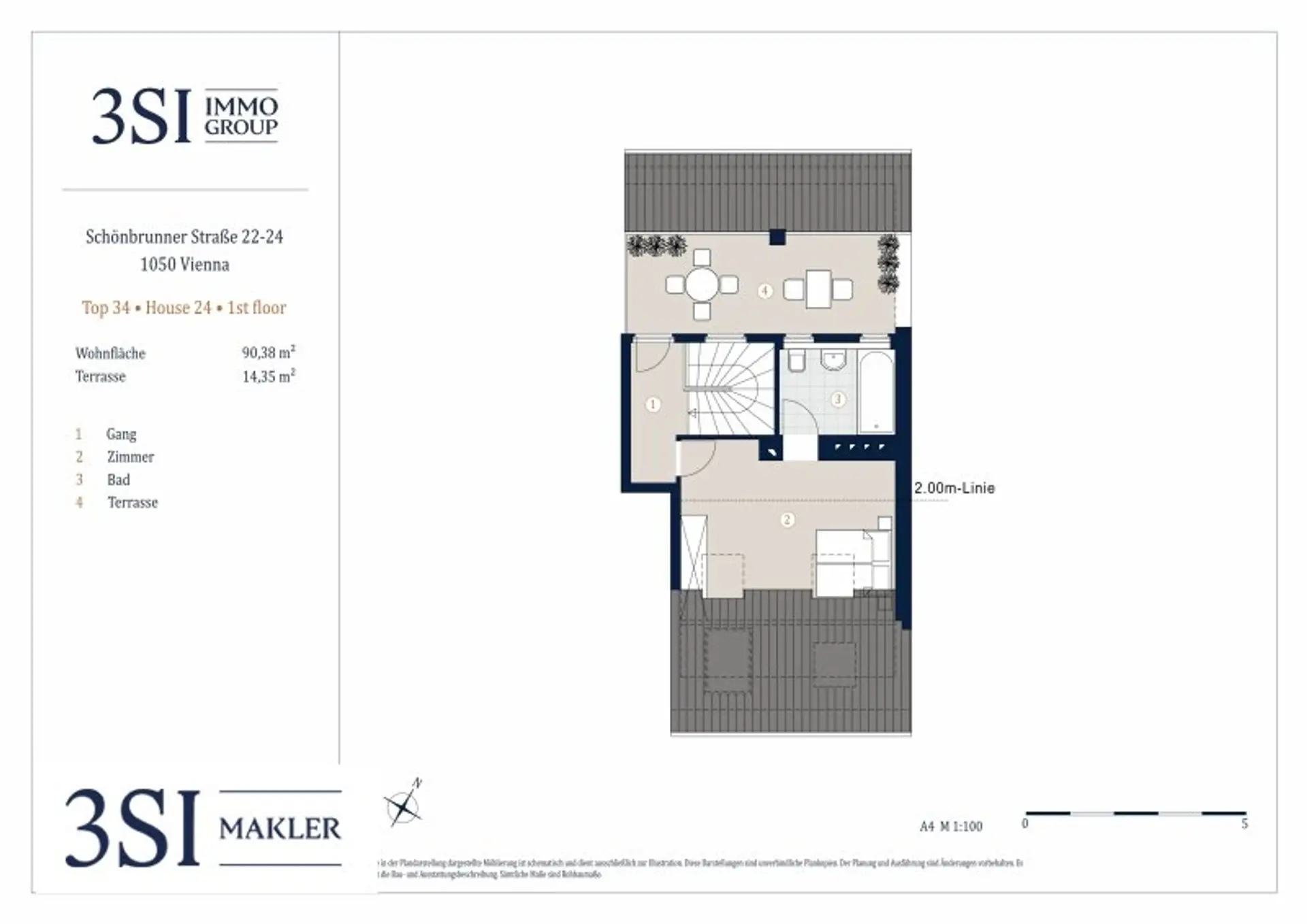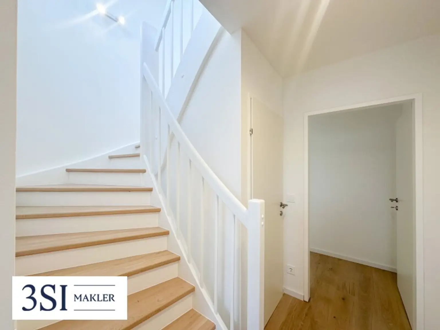 Über eine stillvolle Treppe gelangt man in das obere Geschoss, wo sich ein weiteres Zimmer mit Badezimmer inklusive Badewanne und WC befindet. Von hier aus erreichen Sie auch die Terrasse, die zum Entspannen einlädt und besonders in den Abendstunden mit wundervoller Sonne begeistert.