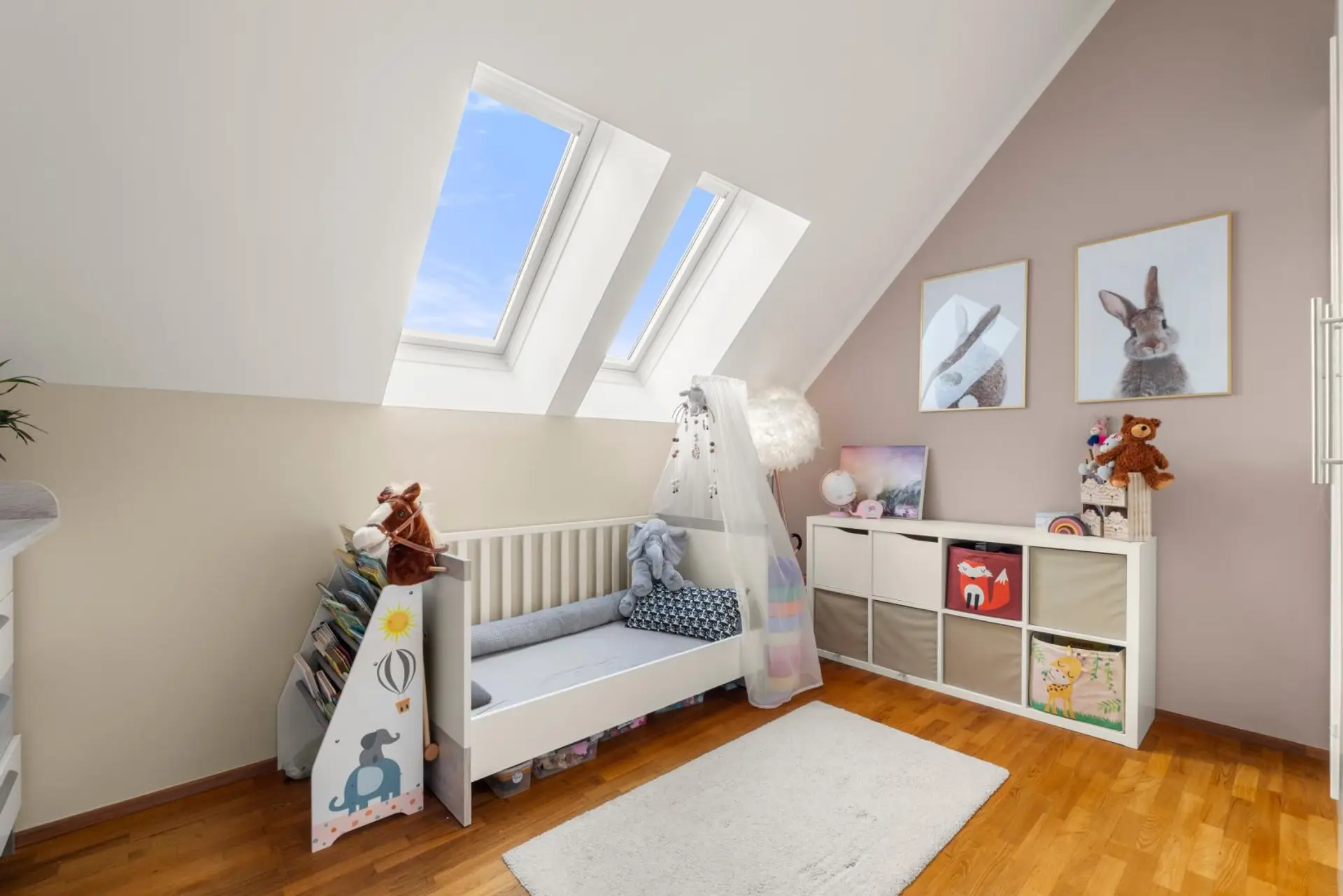 Die Böden in den Wohnräumen wurden mit Parkett, die Böden im Badezimmer und dem WC mit modernen Fliesen gestaltet.