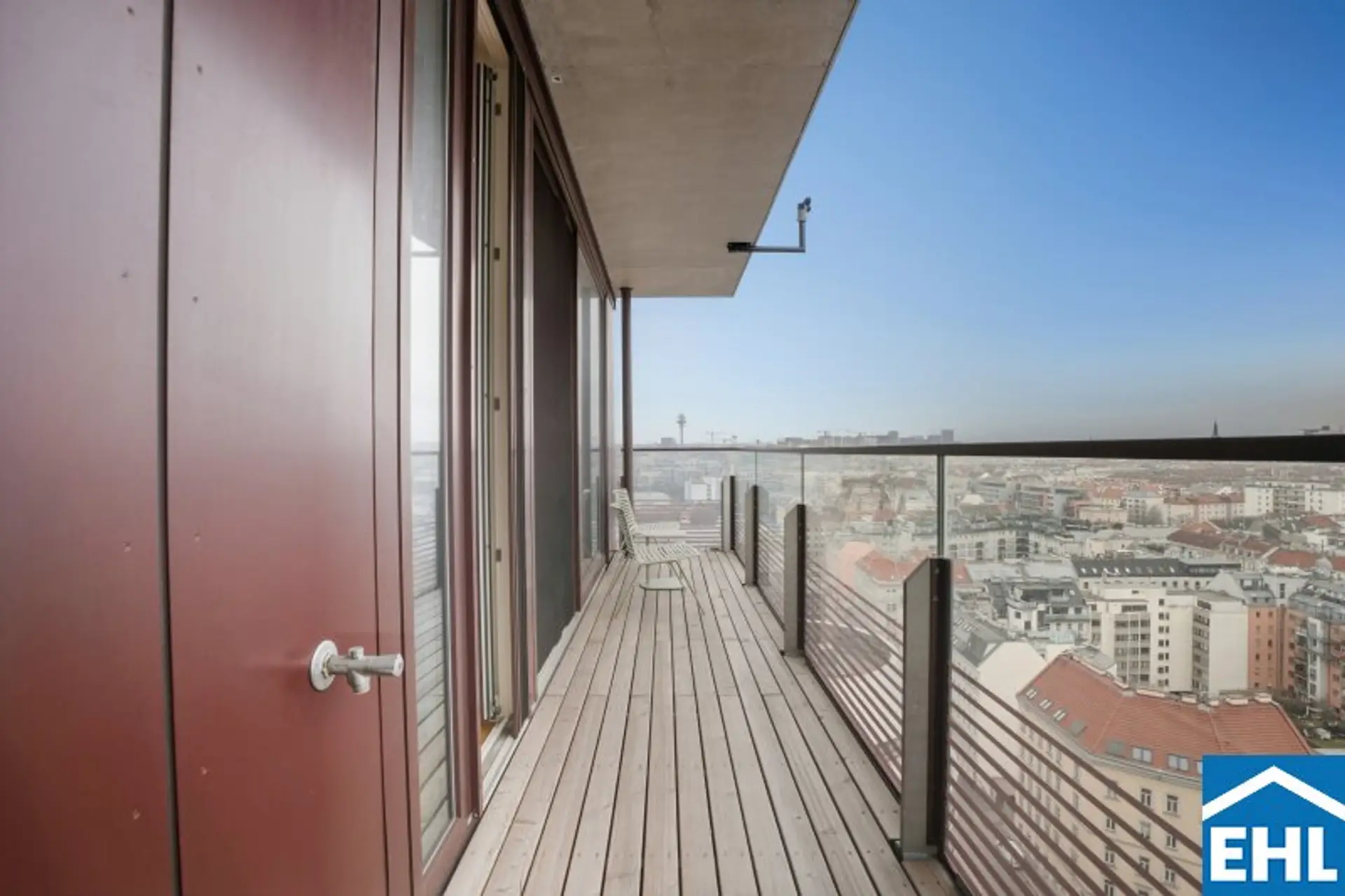 Lichtdurchflutet durch großzügige Fensterflächen eröffnet sie ein Panorama auf die Wiener Hausberge. Besonders in den Abendstunden, wenn die Sonne langsam hinter den Hügeln versinkt und den Himmel in warme Gold- und Rottöne taucht, entsteht ein beinahe magisches Schauspiel. Die großzügige Freifläche erweitert den Wohnraum ins Freie – perfekt für stille Momente über den Dächern der Stadt.