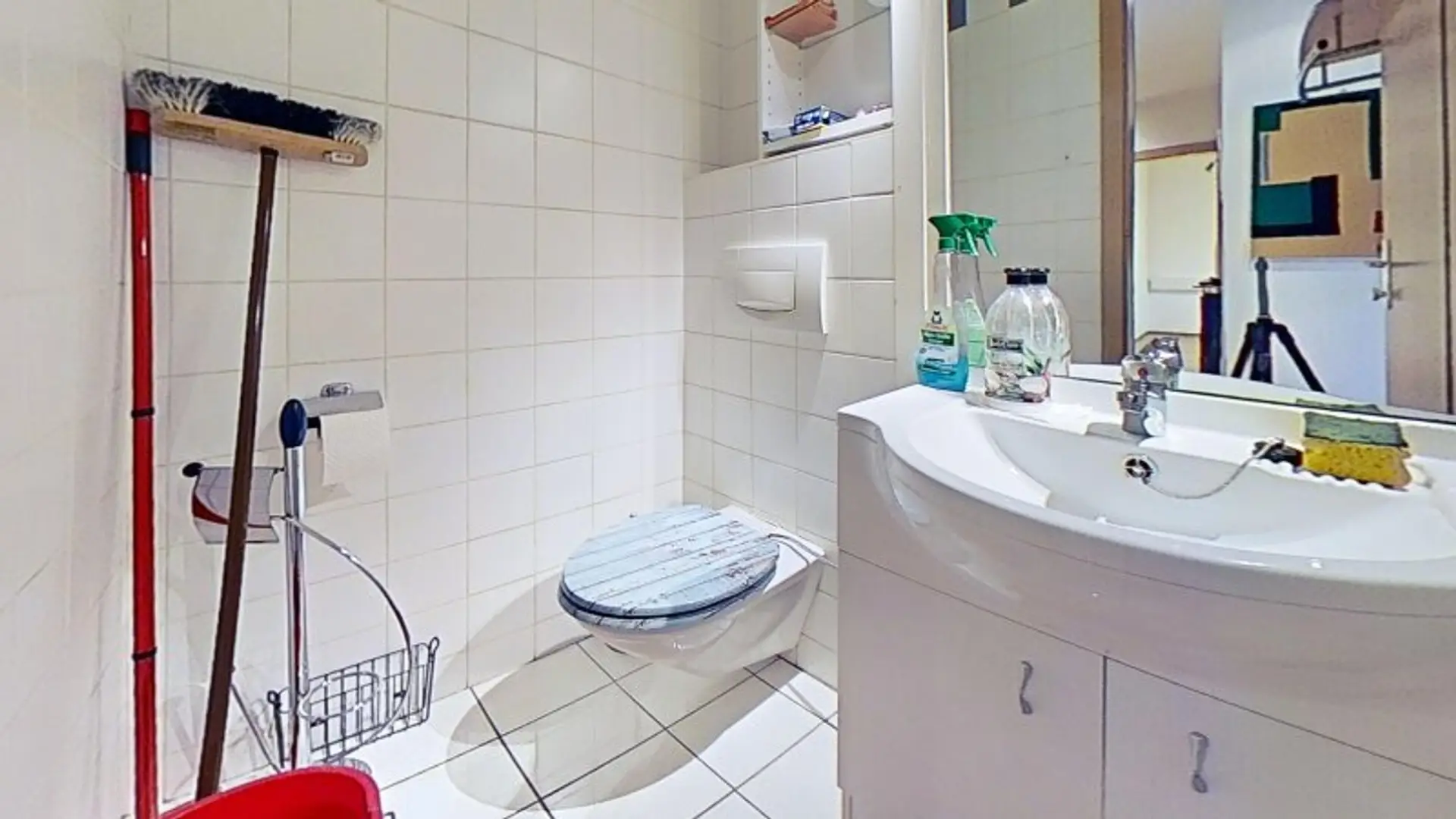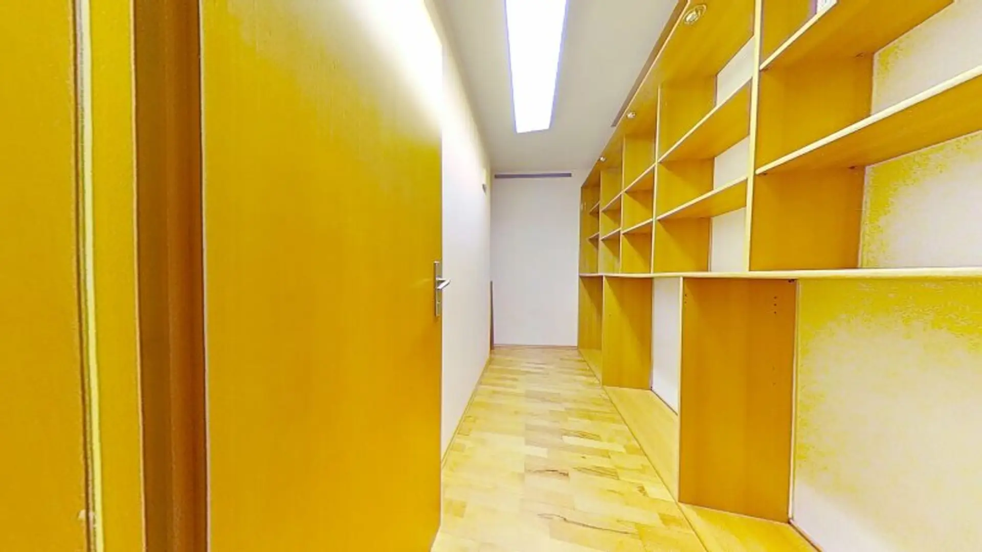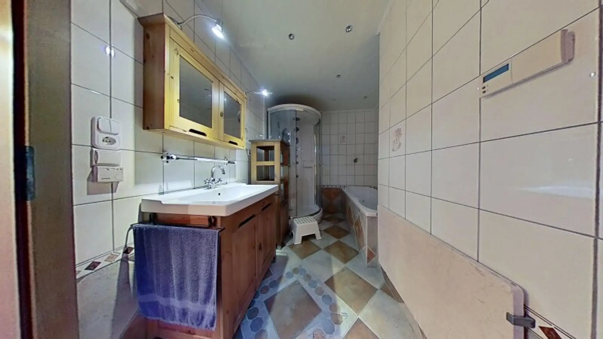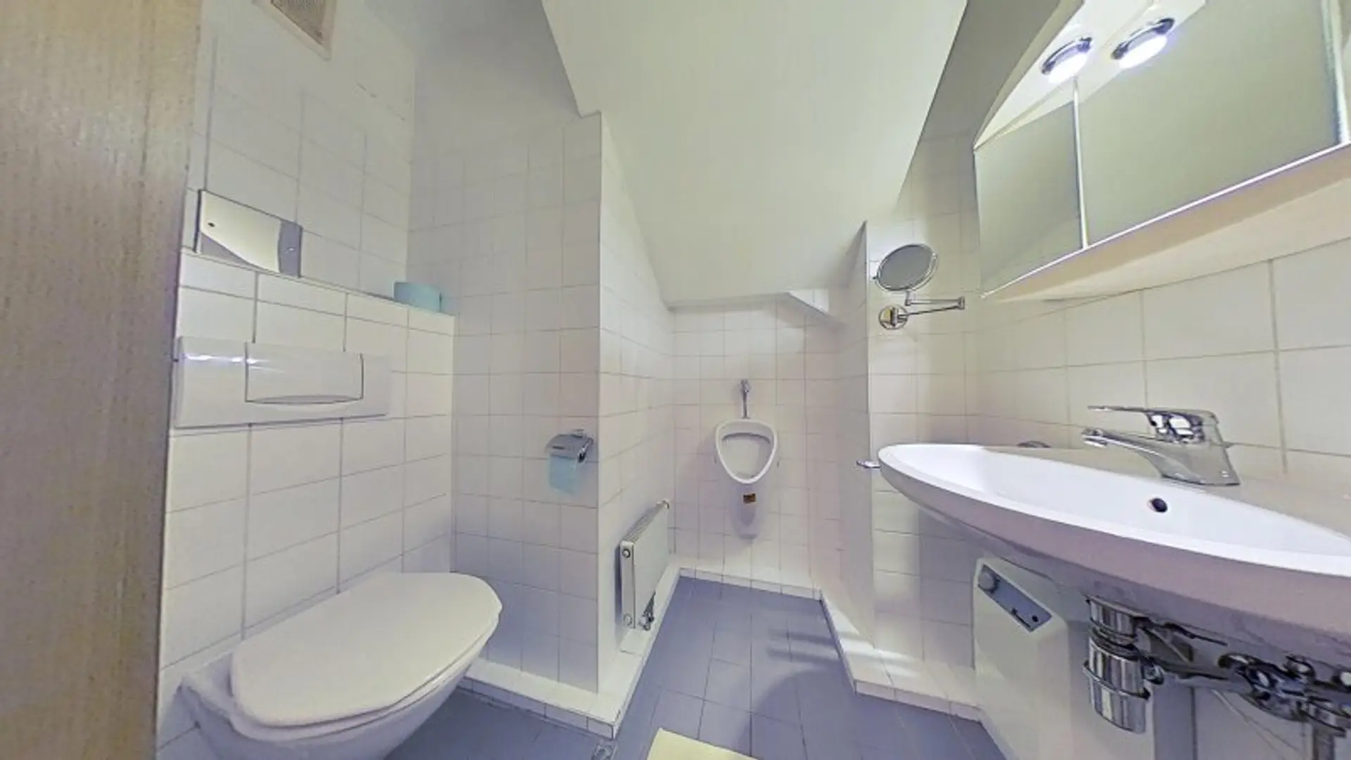 Parkett ist im Wohn- und Arbeitsbereichen, Fliesen in den Sanitär- und Gangbereichen verlegt.
