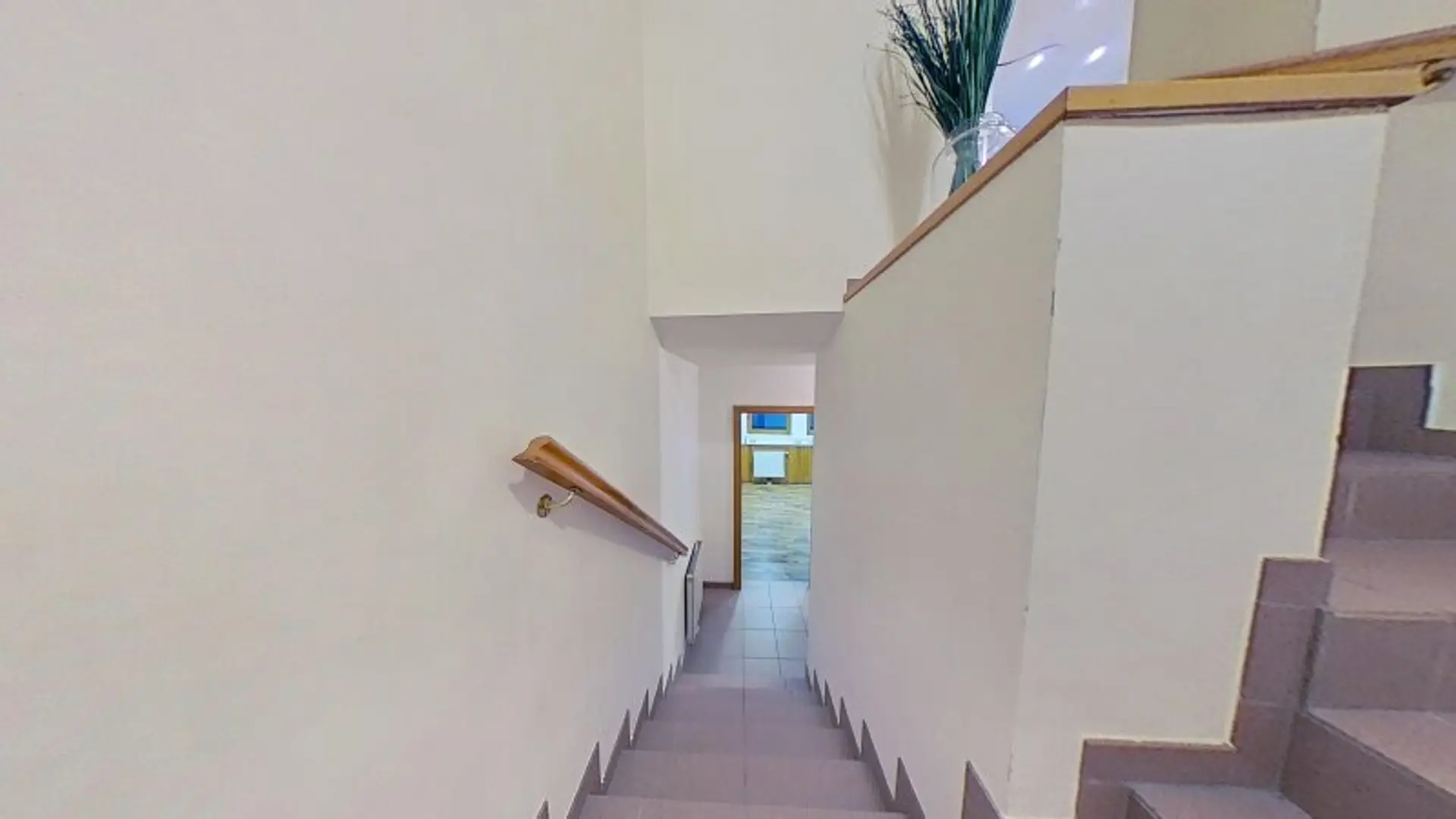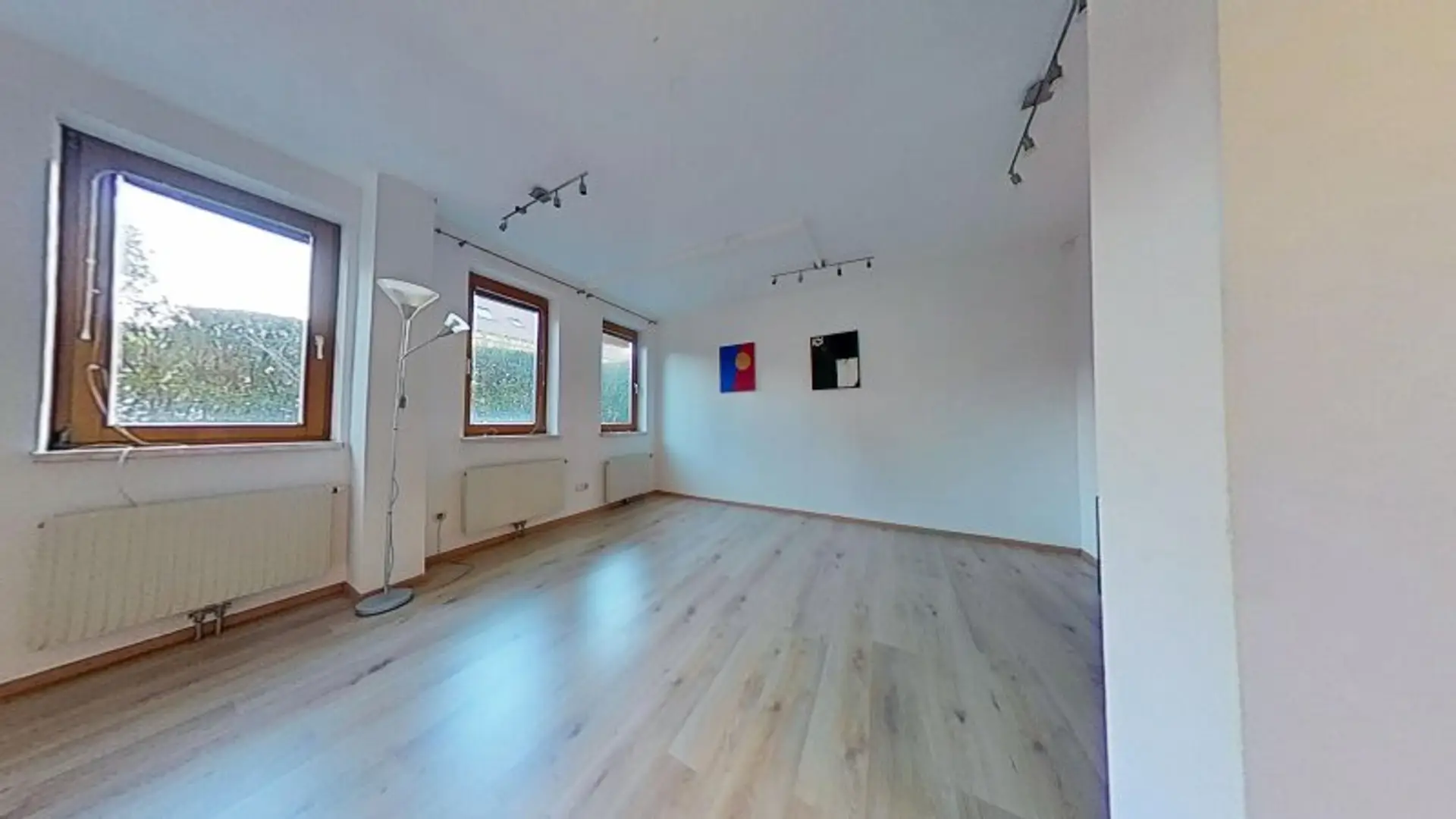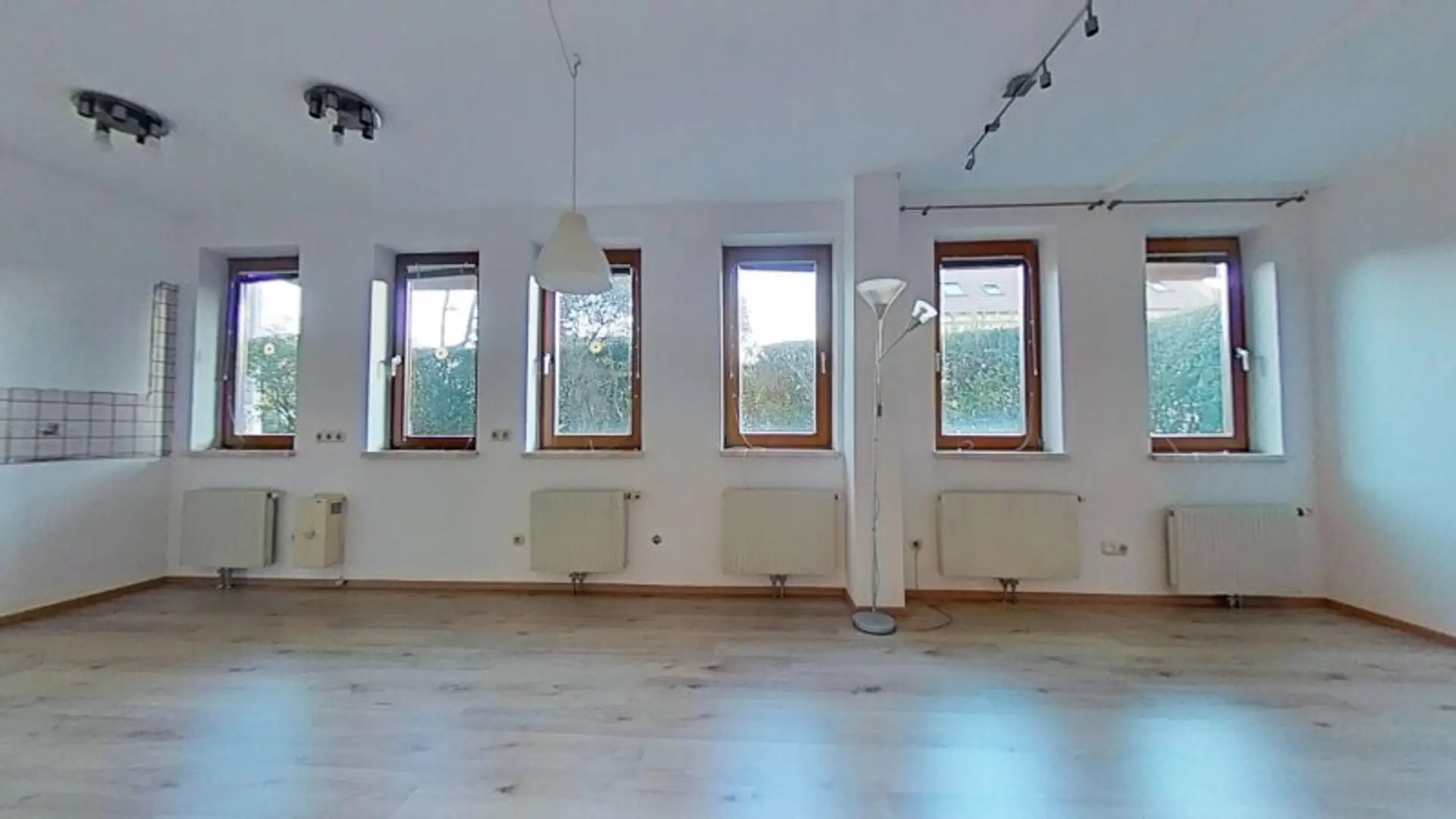 Die zweigeschossige Wohnung liegt in einer kleinen Wohnanlage. Der barrierefreie Eingang befindet sich im Erdgeschoss. Das zentrale Vorzimmer führt rechts in einen als Arbeitszimmer ausgebauten Raum und anschließend in einen großen Wohnraum mit Platz und allen Anschlüssen für eine offene Küche. 2 Fenster im Arbeitsraum und 6 Fenster im Wohnbereich sorgen für ausgezeichnete Belichtung. Neben einem großzügigen WC führen Stufen in die privaten Räume im Untergeschoss.