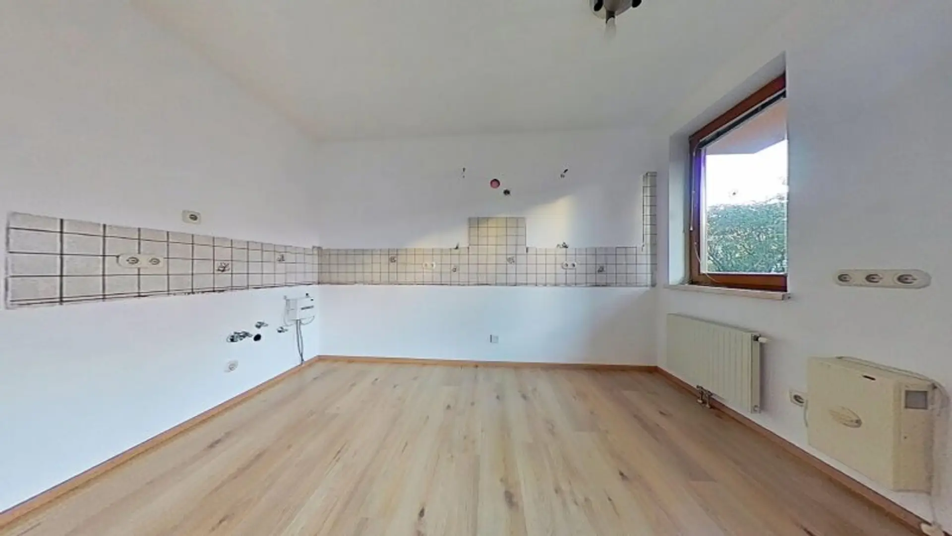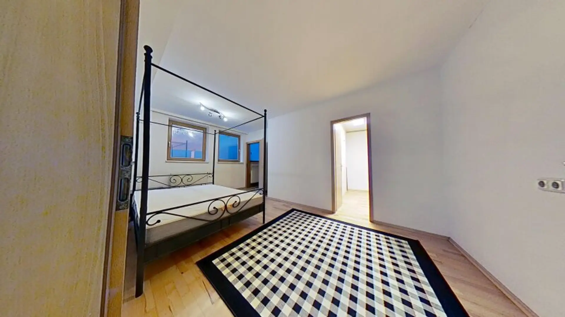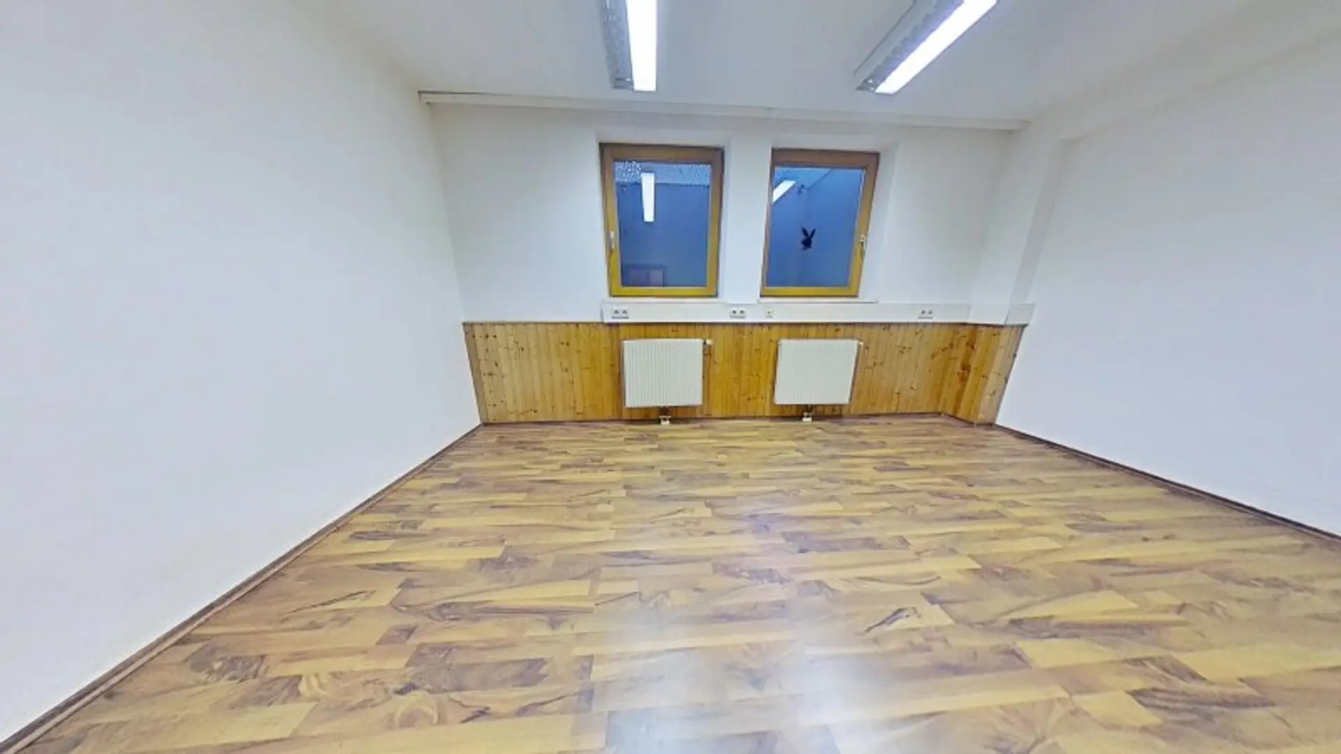 Die zweigeschossige Wohnung liegt in einer kleinen Wohnanlage. Der barrierefreie Eingang befindet sich im Erdgeschoss. Das zentrale Vorzimmer führt rechts in einen als Arbeitszimmer ausgebauten Raum und anschließend in einen großen Wohnraum mit Platz und allen Anschlüssen für eine offene Küche. 2 Fenster im Arbeitsraum und 6 Fenster im Wohnbereich sorgen für ausgezeichnete Belichtung. Neben einem großzügigen WC führen Stufen in die privaten Räume im Untergeschoss.
