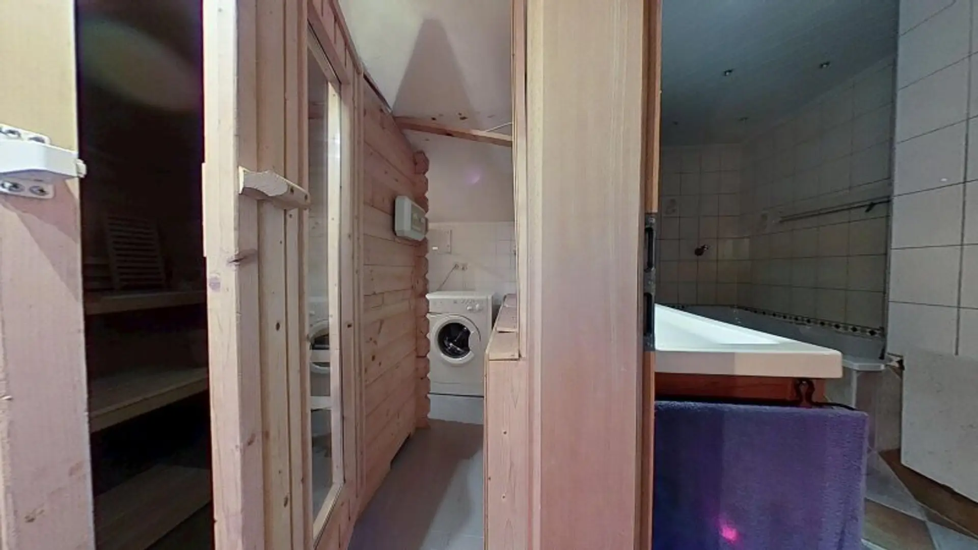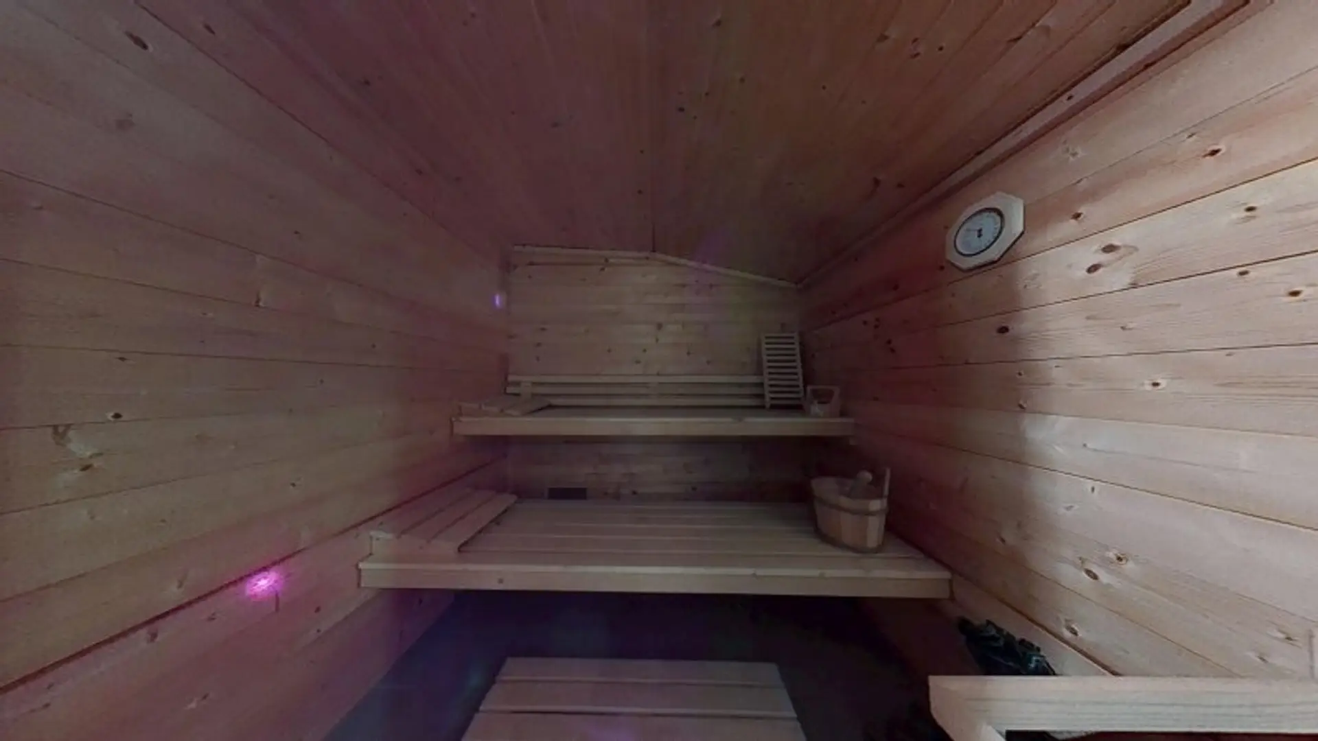 Das Untergeschoss verfügt über ein weiteres WC mit eigenem Pissoir, 2 Zimmer und einen Schrankraum. Der Keller wurde in den Wohnbereich integriert und mit einer Sauna ausgestattet. Hier befindet sich auch der Anschluss für die Waschmaschine.