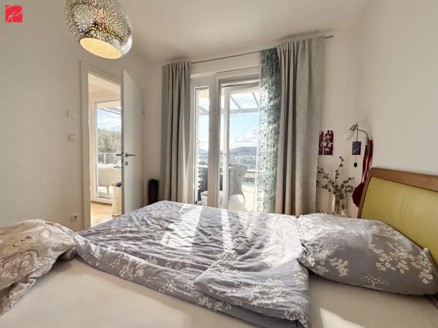 Die beiden freundlichen Schlafzimmer bieten Ihnen Zugang zur Terrasse und sind zusätzlich mit bodenbündigen Fenstern inkl. Beschattung ausgestattet – sodass Sie den Traumausblick direkt vom Bett aus genießen können. Ein (Doppel-)Bett, sowie ein geräumiger Kasten finden hier gut ihren Platz. In der Küche erwarten Sie reichlich Arbeitsflächen und Stauraum, sowie hochwertige Küchengeräte zum Zubereiten von Köstlichkeiten. Durch die offene Raumgestaltung, bleiben Sie trotz Vorbereitungsarbeiten im Gespräch mit Ihren Gästen. Das in stilvollem beige gehaltene Badezimmer ist mit einem Fenster, einem Waschtisch, einem elektrischen Handtuchtrocker, einer eleganten Walk-In Dusche mit Fixglas-Element und einer Regendusche ausgestattet.