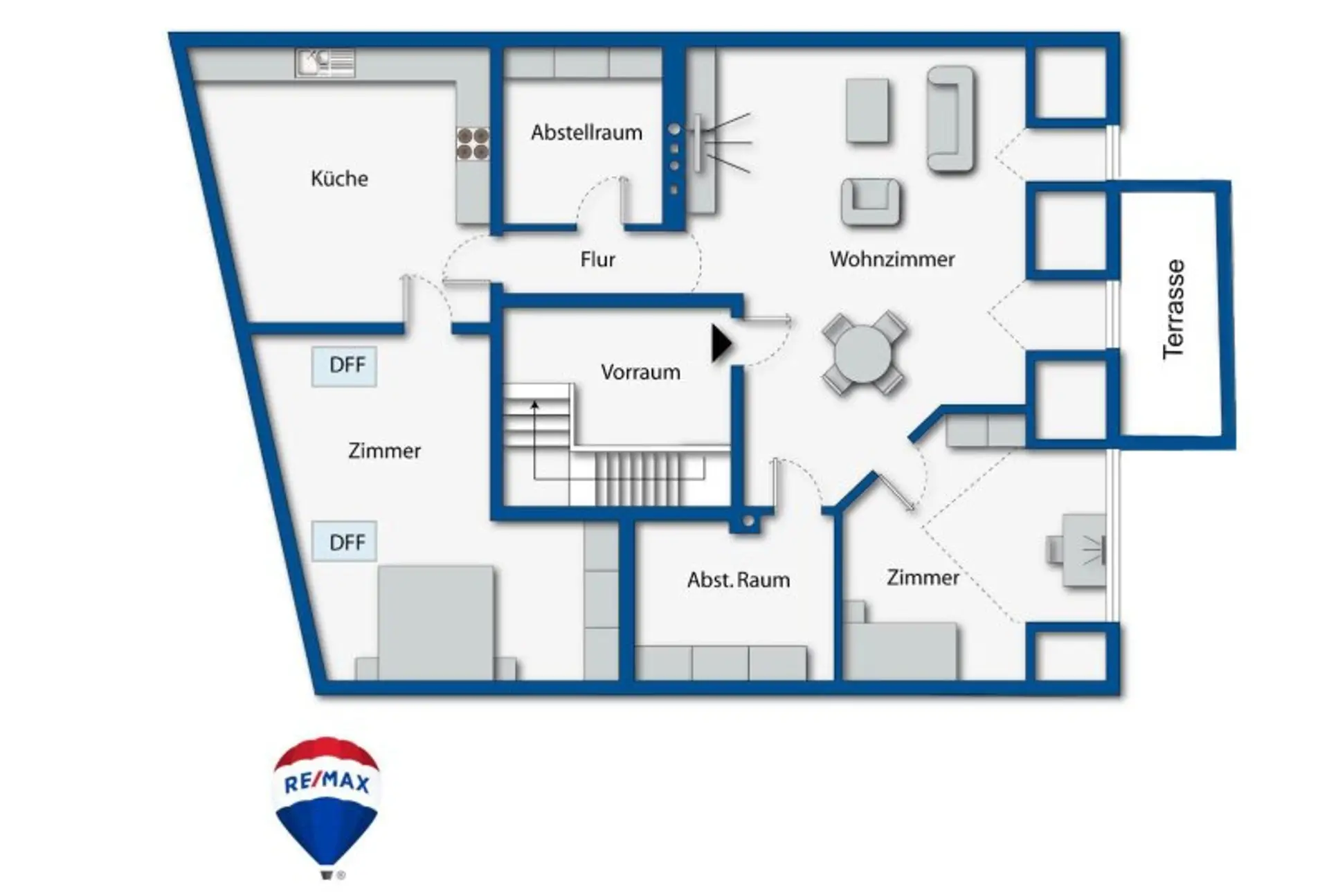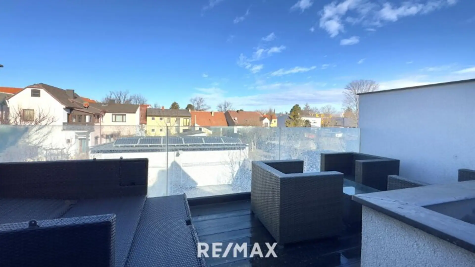- Wohnung mit ca 109 m² , Wohnzimmer, Küche, 2 Schlafzimmer ,Schrankraum, Bad, Toilette, Vorraum, 12 m² Dachterrasse