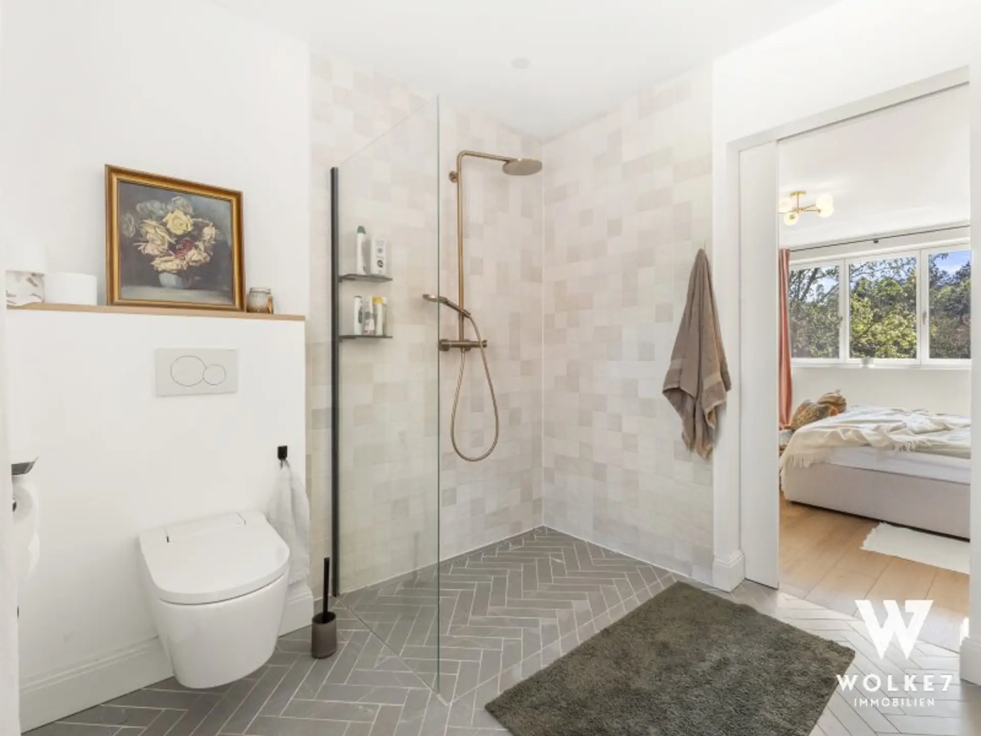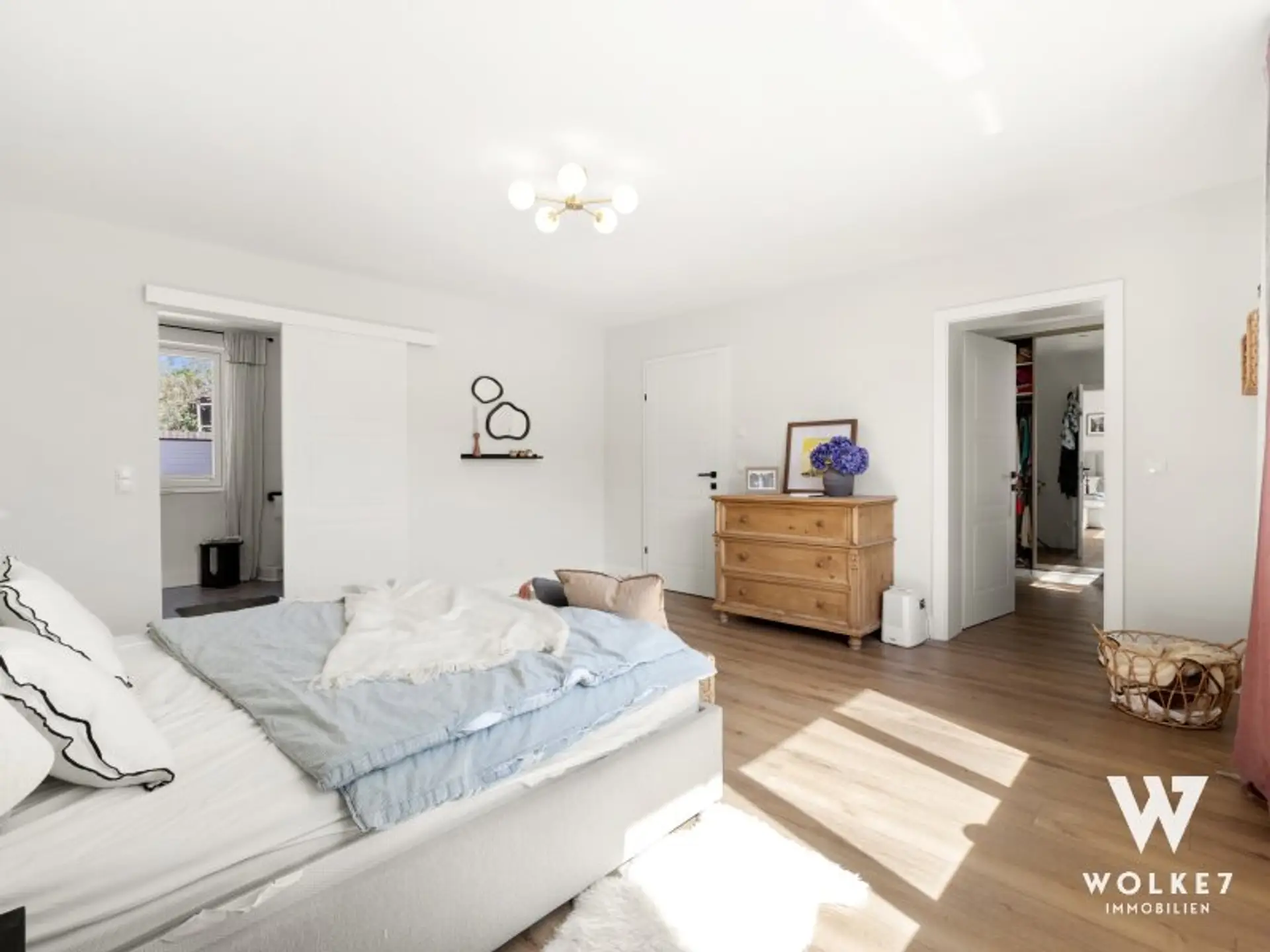 Neben zwei weiteren Zimmern bildet der Masterbereich ein echtes Highlight. Mit eigener Ankleide, stilvollem Badezimmer, maßgefertigtem Doppelwaschtisch und moderner Duschtoilette entsteht hier ein privater Rückzugsort, der Komfort und Eleganz vereint.